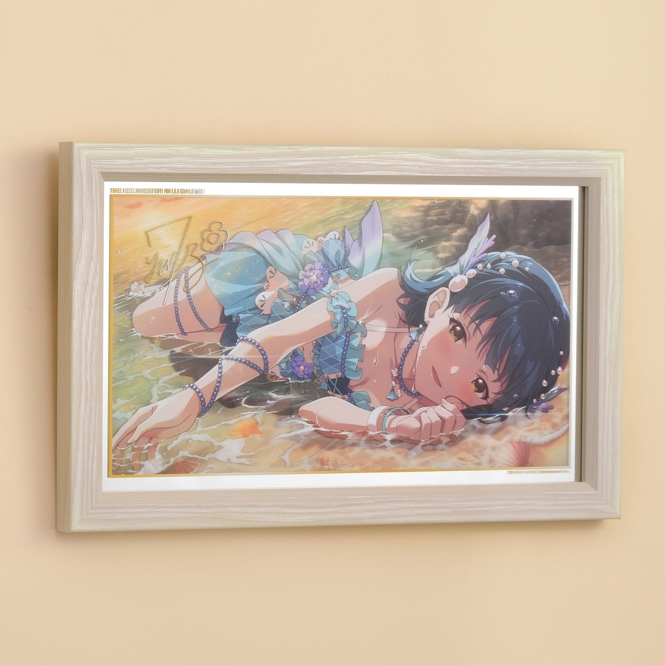 ずっしりとした木枠に収められた美しく輝くガラス製のミラー。ガラス製ミラーの特性に合わせた処理が可能にしたポートレート写真のような奥行きのある立体的な表現。夕暮れの海原を背景に、波打ち際に横たわりながら微笑みを浮かばせる彼女の魅力に溢れた一枚がここに完成しました。