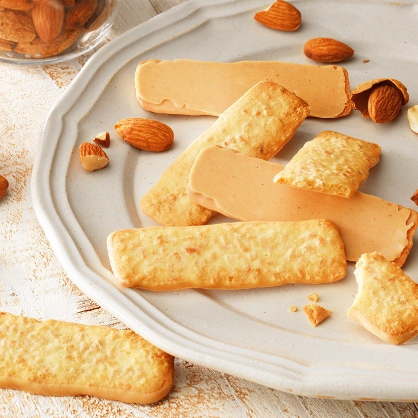 刻みアーモンドをたっぷりと練り込んで焼き上げたクッキーの片面に、香ばしいアーモンドの風味豊かなホワイトチョコレートをコーティングしました。アーモンドの魅力を存分に味わえるバトンクッキーです。
