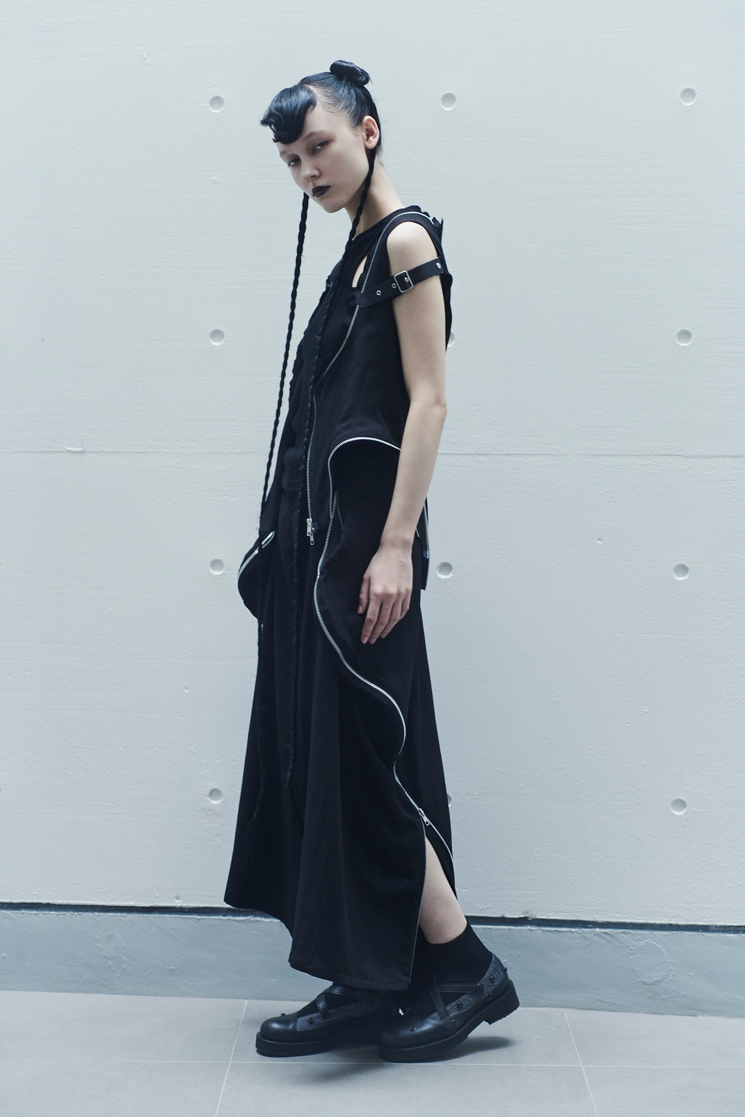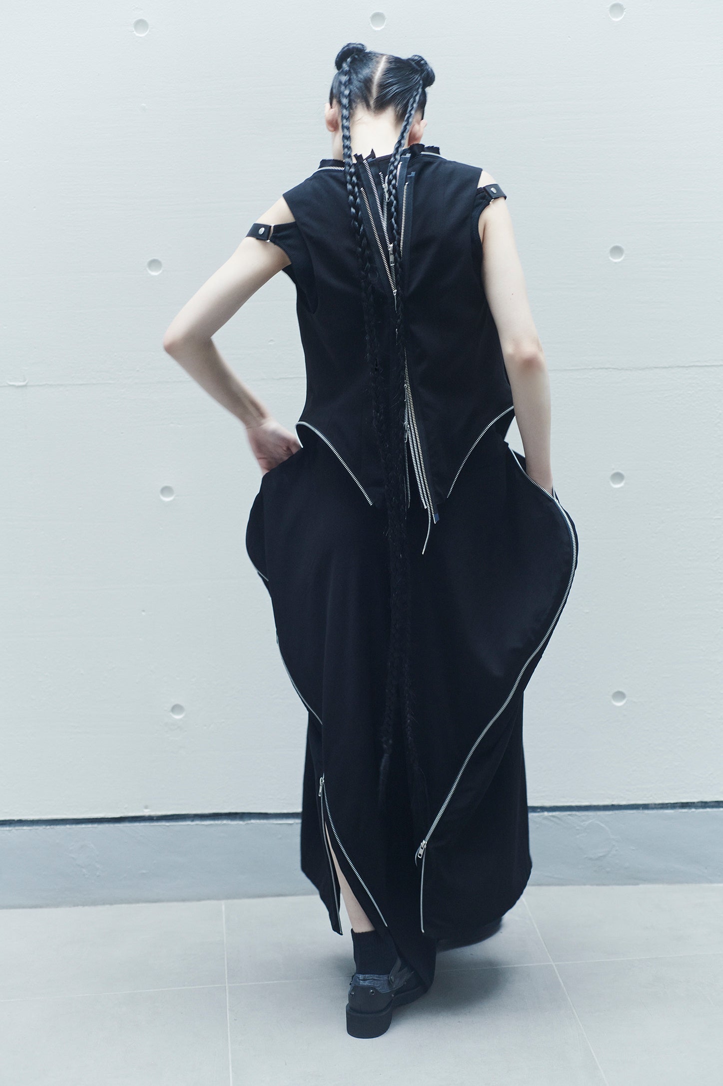 前中心にWファスナー、コルセットシルエット、背中心に配した3本のWジッパーのレイヤード