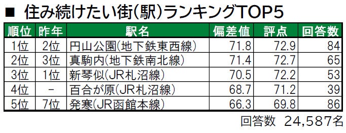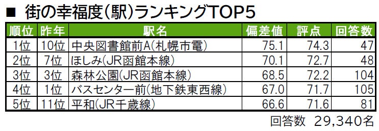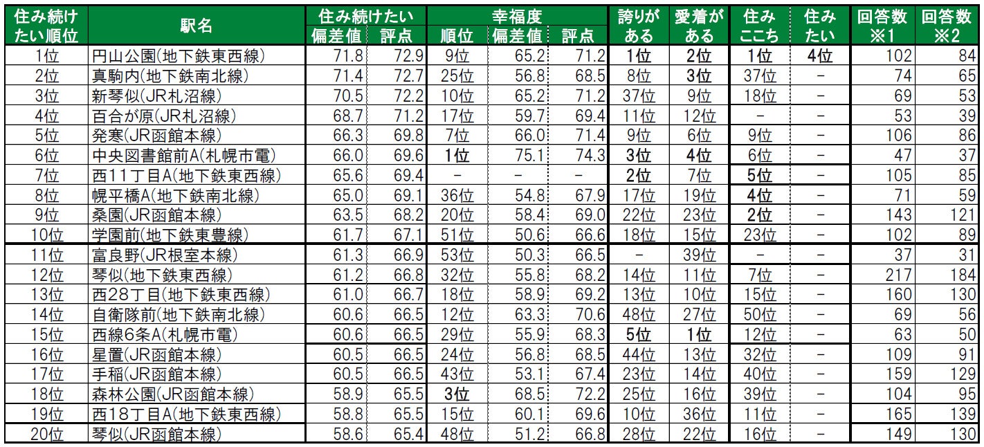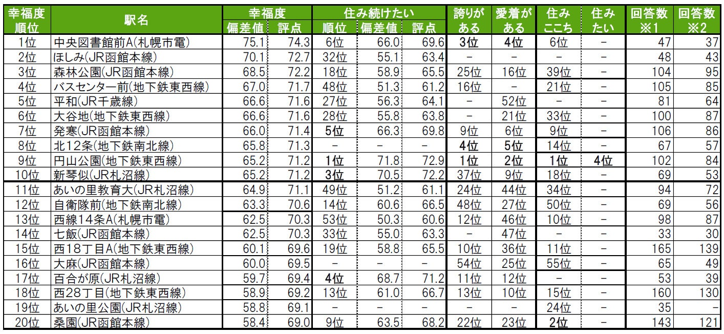 1位は中央図書館前Aで、「街に誇りがある(駅)」3位、「街に愛着がある(駅)」4位となっています。2位はほしみで、「住み続けたい街(自治体)」で6位の札幌市手稲区にある駅です。3位は森林公園で、「住み続けたい街(自治体)」で2位の札幌市厚別区にある駅です。