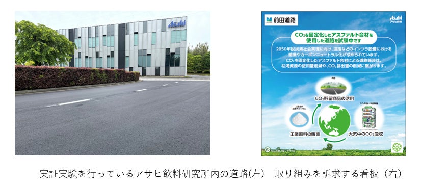 アサヒ飲料と前田道路は、2023年8月から道路などのインフラ設備を利用したCO2資源循環システムの開発および検証に着手しました。アサヒ飲料がCO2吸収材を前田道路に提供し、前田道路はそのCO2吸収材を利用したアスファルト混合物の道路用材料としての可能性を検証しました。CO2吸収材の道路用材料としての適用性やそれを利用したアスファルト混合物の仕様規定への適合性を確認し室内検証を終了したため、実道への適用に向けて施工性や耐久性等を評価します。合わせてアスファルト混合物の製造方法の検討や環境負荷の低減度等を検証し、全国の約120万kmに渡ってネットワークされた道路の一部に適用した場合の効果も確認する予定です。