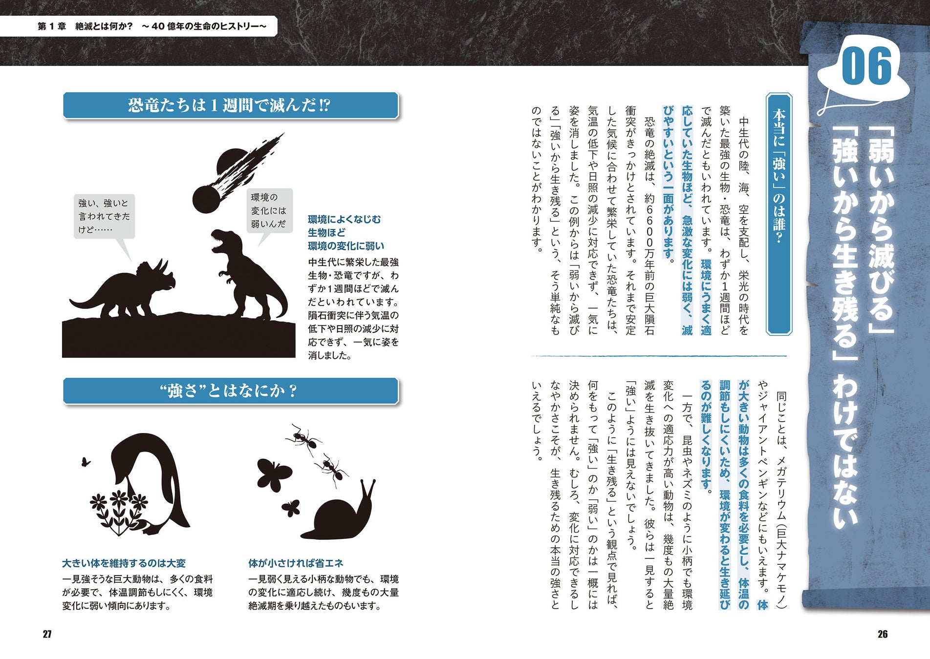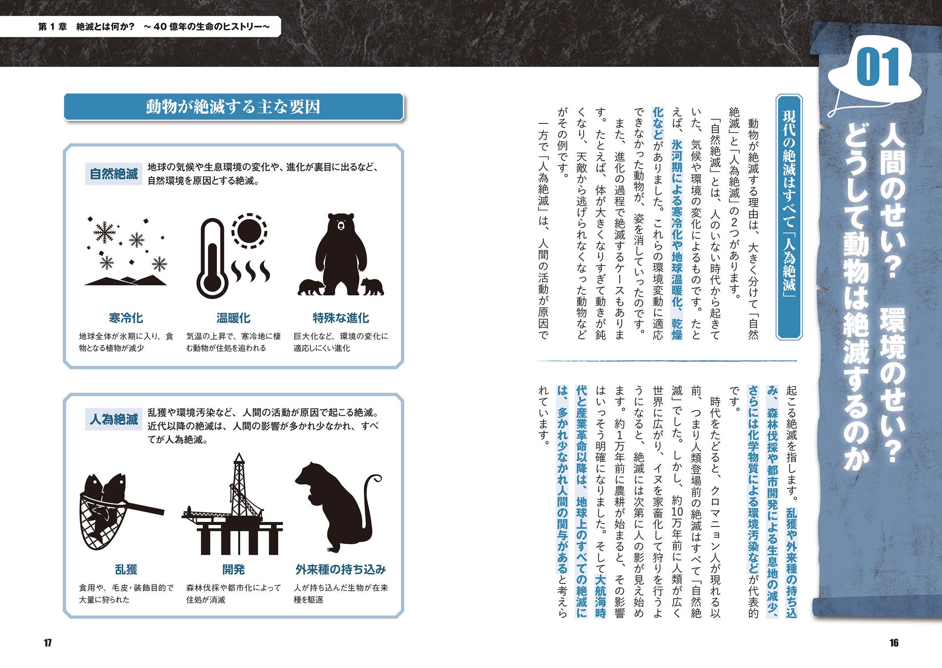 本書では、発見からわずか30年足らずで乱獲により姿を消した「ステラーカイギュウ」や、進化の果てに巨大化しすぎた「ジャイアントペンギン」、そしてクローンで復活しながらも再び絶滅したヤギ「ピレネーアイベックス」など、驚きと悲哀に満ちた絶滅のエピソードを豊富な図解とともに紹介します。