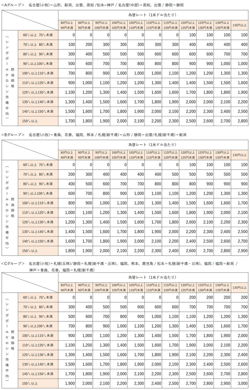 なお、燃油特別付加運賃は、シンガポールケロシン市況価格および為替レートの変動に応じて、 1ヶ月毎に見直しております。