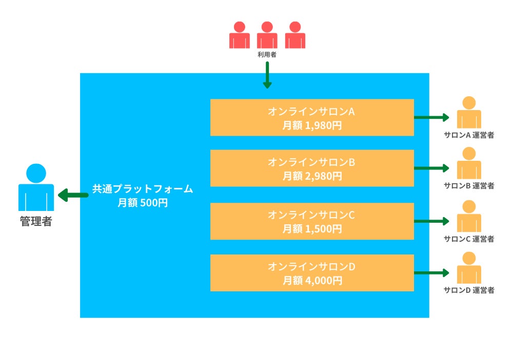 ユーザーは、プラットフォームのシステムを用いて、自分オリジナルのオンラインサロンや会員制webサイトを作ることができ、管理運営を行えます。