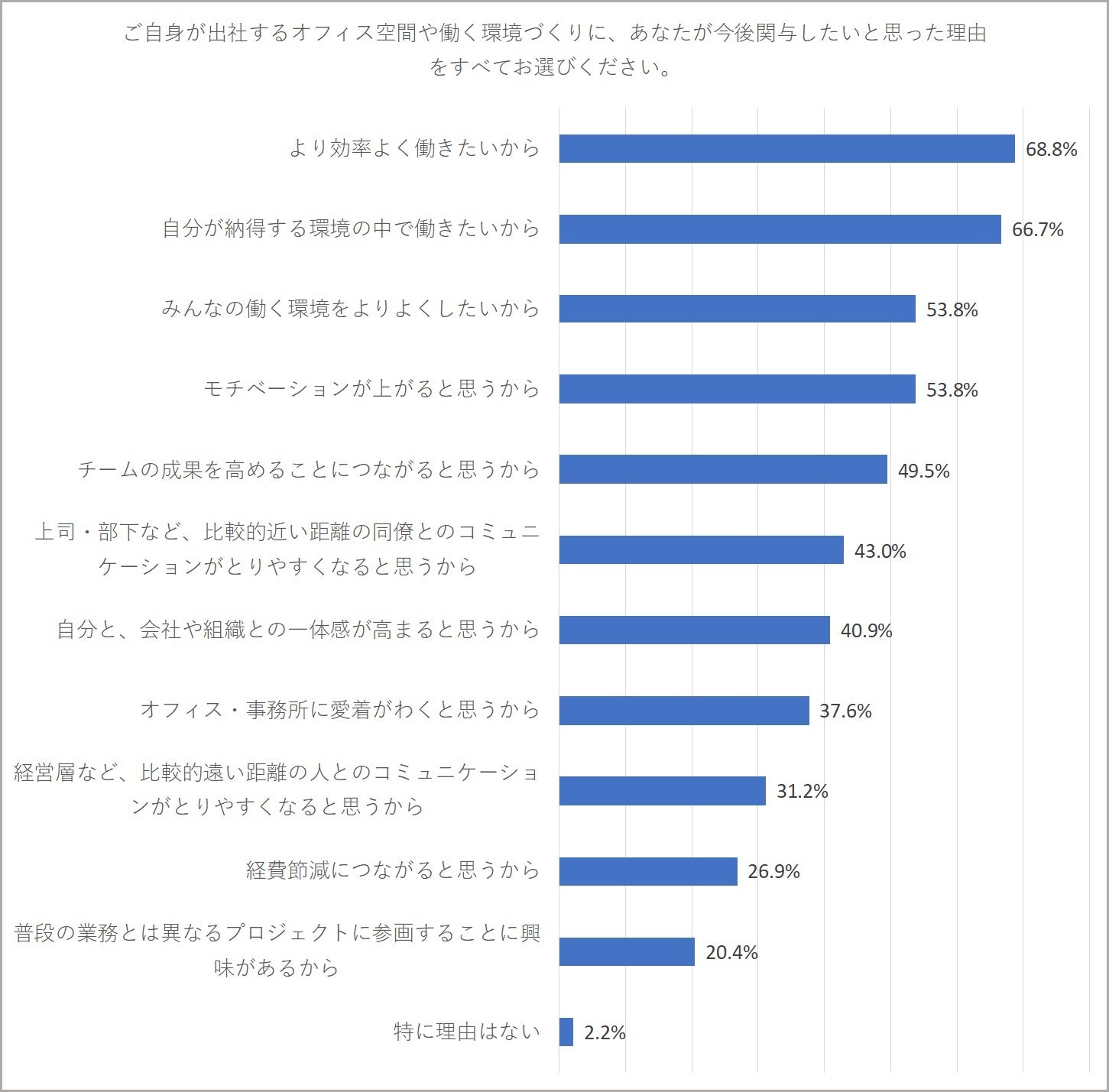 この結果から、ワーカーにとって、オフィスづくりへの参画が、自らの働く環境への関心を満たす必要な要素となると考えます。