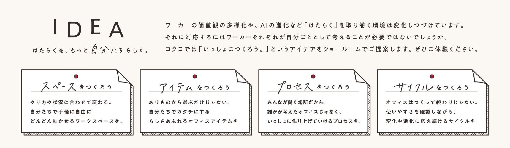 昨今では、コロナ禍以降、社会や経済等の不確実さが増し、従来とは異なる価値観や働き方の変化が加速しています。そこでコクヨでは、オフィスの価値や働き方において、多様な個人の価値観を大切にし、お客様のワーカーひとりひとりとの対話を通し、ワークプレイスや商品等を、“いっしょに作り上げていく”という考えをコンセプトに据えました。