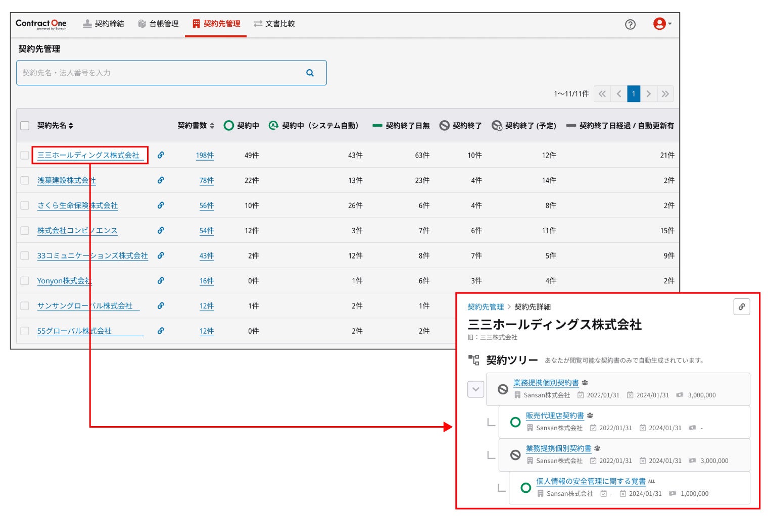 また企業名をクリックすると、該当企業と締結している契約書を親契約・子契約といった階層構造で表示できる詳細画面に遷移します。これにより、特定の企業に関する契約状況を網羅的かつ効率的に把握できます。