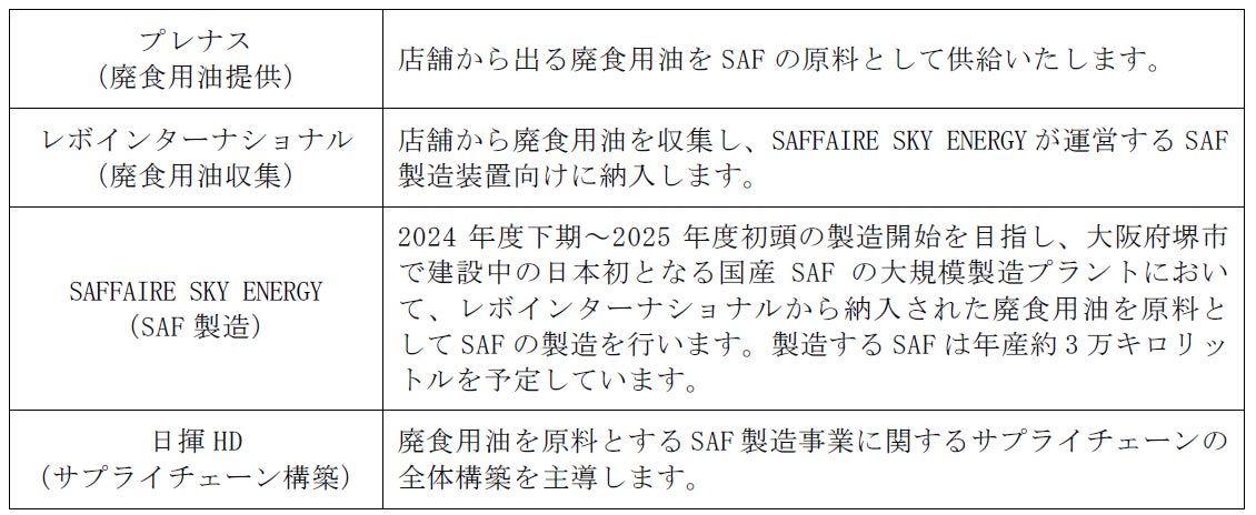 当社と日揮ホールディングス株式会社(以下日揮HD)、株式会社レボインターナショナル(以下レボインターナショナル)、合同会社SAFFAIRE SKY ENERGY(以下SAFFAIRE SKY ENERGY)の4社は国内SAFの供給に貢献していきます。