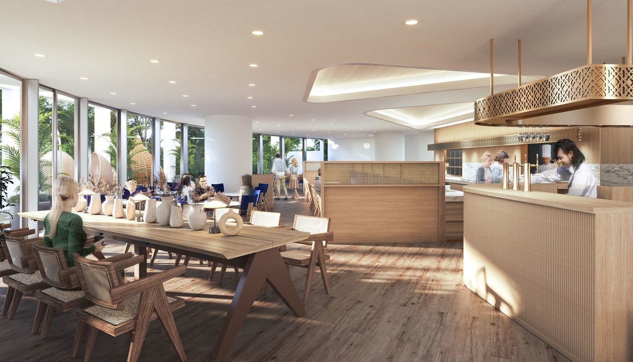 レストラン「L’AZUR(ラ・ジュール)」は、設えやコンセプトを一新し、非日常を感じる贅沢な食体験を提供するレストランへと生まれ変わります。勝浦の自然や新鮮な食材にマッチする明るく開放的な空間は、折上天井と床を木目調で仕上げ、ナチュラルな空間の中に竹細工ディテールと勝浦の海をイメージしたブルーがアクセントになっています。ボックス席やベンチ席と入り口付近にはビックテーブルを設け、ご利用シーンに応じたレイアウトでお食事をお楽しみいただけるほか、カフェタイムにはワークスペースとしてもご利用いただける空間となります。