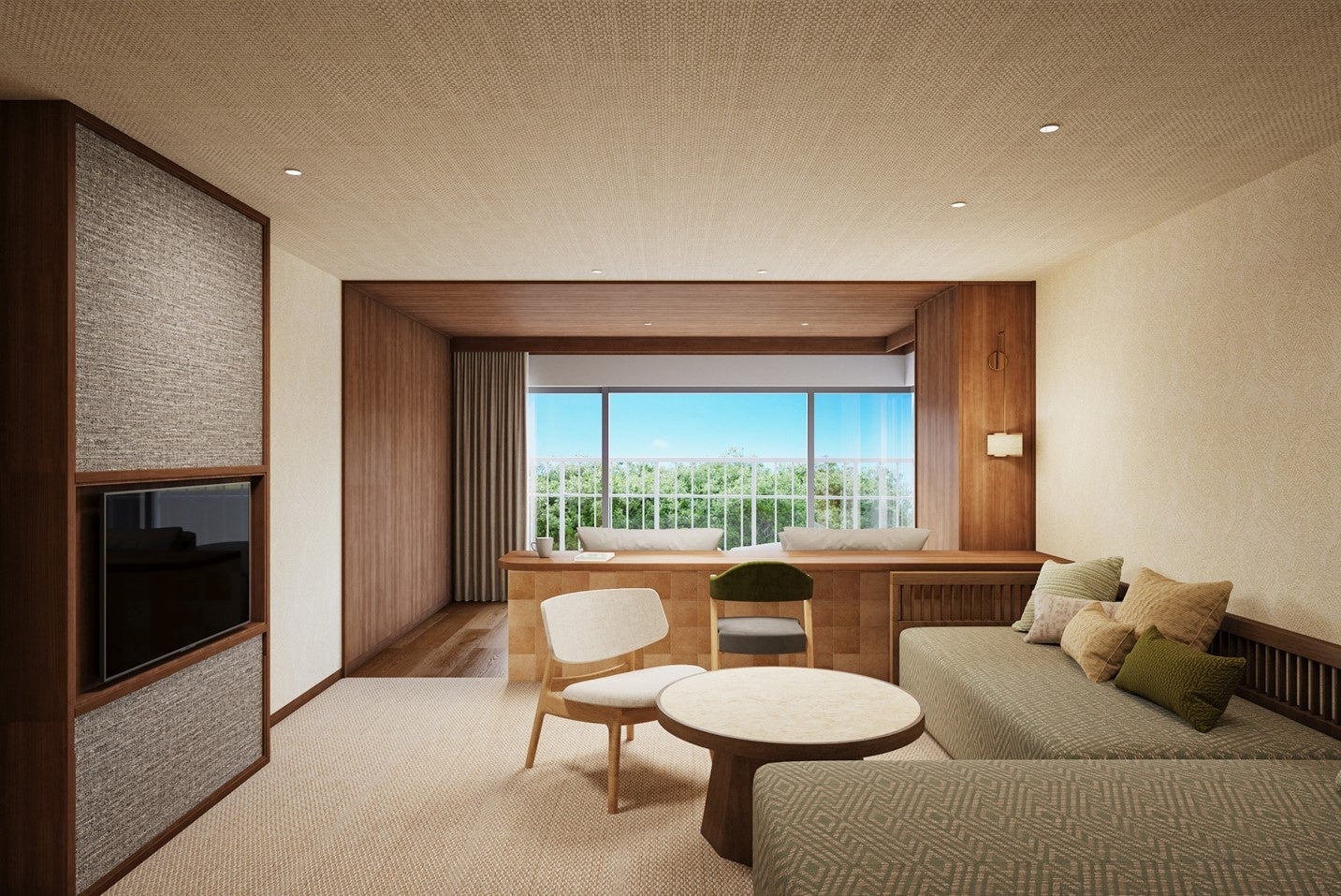 客室は全室南向きのオーシャンビューを活かし、一部「和室」タイプをリニューアルいたしました。室内を浴室・洗面台を備えた「機能エリア」、広々としたソファとワークスペースとしても利用できるテーブルを配した「リビングエリア」、空や自然を望み快適な睡眠へ誘う「寝室エリア」と、素材の切り替えや家具の配置によってゆるやかにゾーニングし、複数の “居場所がある” くつろぎの空間としました。明るくナチュラルな素材と落ち着いた色味のインテリアで、心地よく滞在できるサードプレイスをご提供いたします。