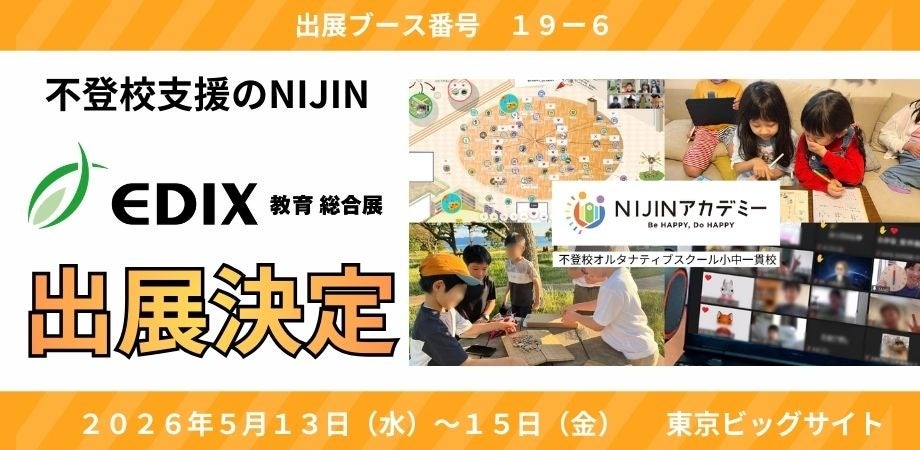 株式会社NIJIN(本社:東京都江東区、代表取締役:星野達郎)が運営する不登校オルタナティブスクール「NIJINアカデミー」は、2026年5月13日(水)~15日(金)の期間、東京ビッグサイト南展示棟にて開催される「第17回EDIX(教育総合展)東京」に、自社ブースを出展いたします。