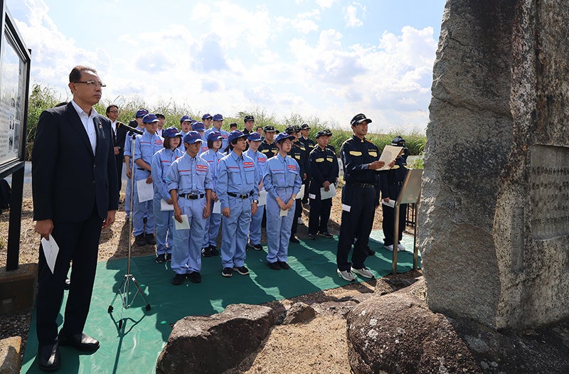 その後、職員代表が「我々は、「大塚切れ」を決して忘れることなく、心に刻み込み、大塚切れからの復旧やその後の水防対策に取り組まれた先人たちの並々ならぬご労苦に感謝するとともに、この大塚切れを後世に伝え、市民の安全・安心を守り続けて行くことを、改めてここに誓います」と決意を述べ、参加者は「大塚切れ」の歴史を胸に刻むとともに、水害から市民の生命・財産を守り続ける決意を再確認しました。