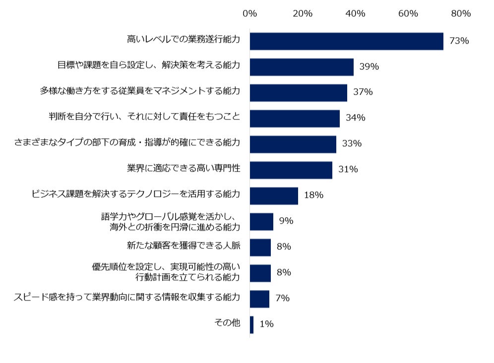 ここ2~3年と比較して、ミドル人材に求められるスキルに変化があるかを伺うと、72%が「変化してきている」と回答しました。続いて、35歳以上のミドル人材に採用企業が求めるスキルの上位3つを伺うと、トップは「高いレベルでの業務遂行能力」(73%)でした。ミドル人材に求められるスキルの変化については、具体的なコメントも紹介します。
