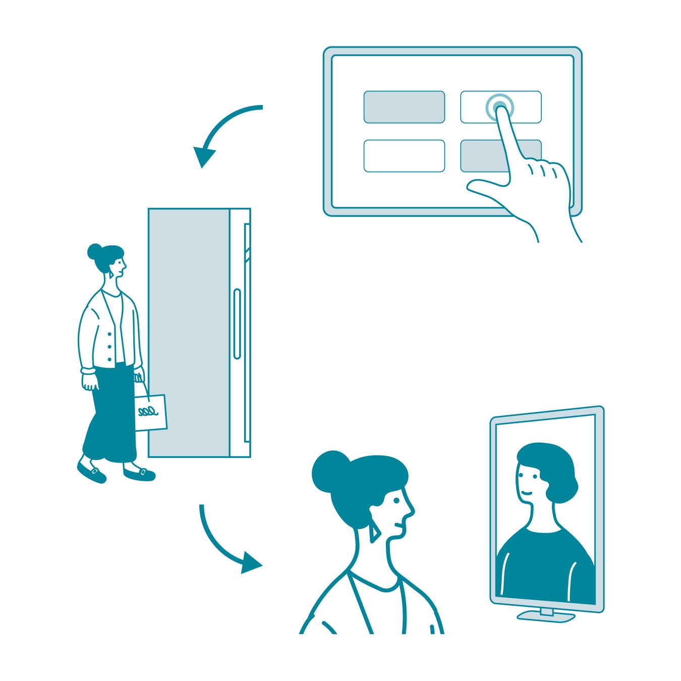 ▲CocoDeskに立ち寄った利用者は、利用サービスを選択して入室し、オンラインで接客を受けることができる