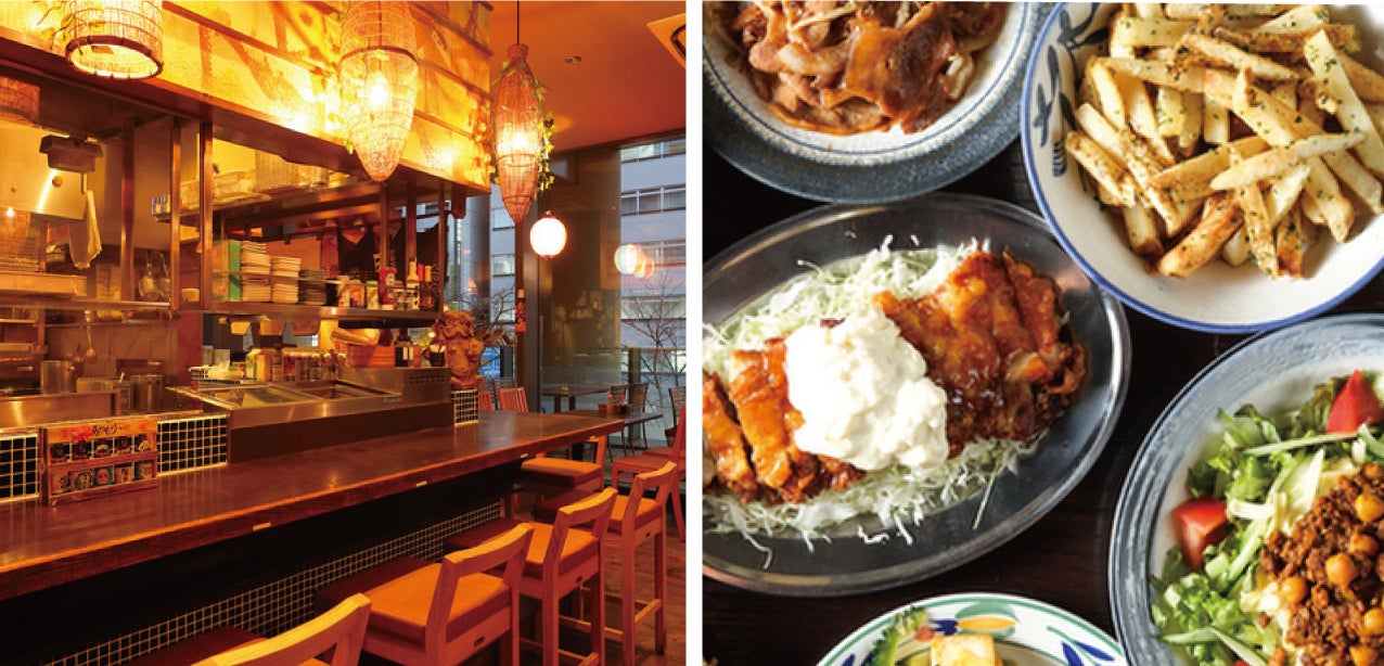 九州・沖縄の郷土料理、地元の美味しいお酒を楽しめます。活気あふれる明るい店内は沖縄感満載。オリオンビールの乾杯からスタートすれば、海ぶどう、島らっきょ、ゴーヤチャンプル、スパム、ラフティ、もずくの天ぷらなど、定番の沖縄料理がずらりとテーブルに並びます。オリオンビールの他に、泡盛やシークヮーサー、さんぴん茶を使った沖縄ならではのお酒も充実。ご当地グルメとご当地のお酒は沖縄気分を堪能できます。
