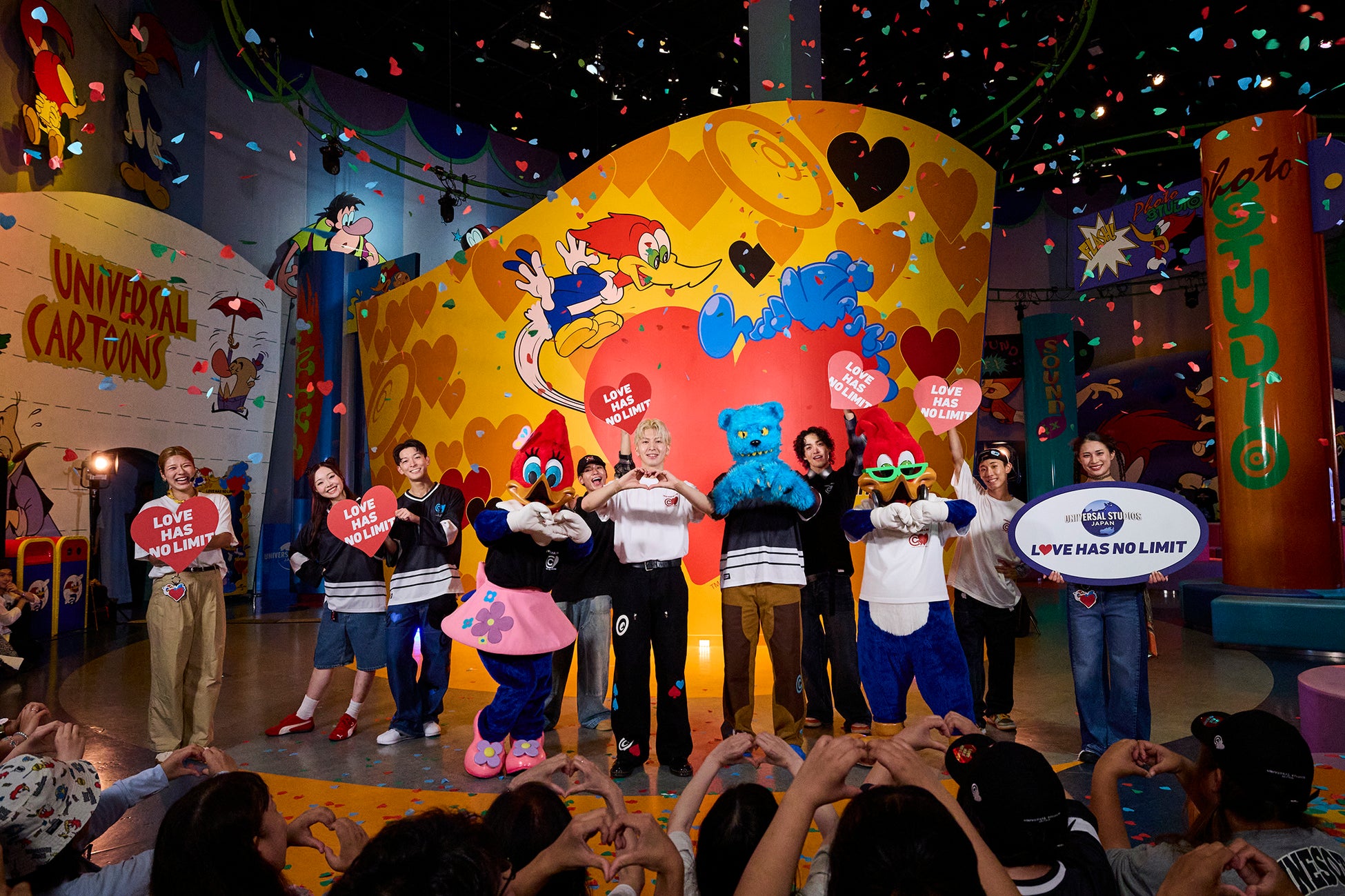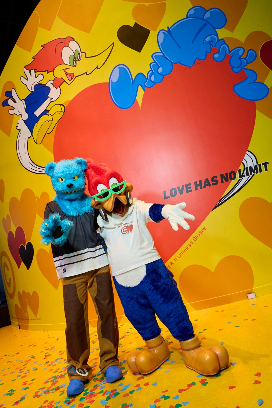 スぺシャルポップアップイベントの会場となったのは、アトラクション「アニメ・セレブレーション」のポストショーエリア。1日限りの会場装飾として、LOVE HAS NO LIMITのハートモチーフが一面にちりばめられ、いつものコミカルな空間から、LOVEが溢れる空間に様変わり。なかでも、ひときわ存在感を放つ高さ約5mのウォールアートには、今回のコラボレーションのメインアートのLOVE HAS NO LIMITの巨大なハートロゴが描かれており、会場に足を踏み入れるゲストのみなさんもその迫力に圧倒されていました。