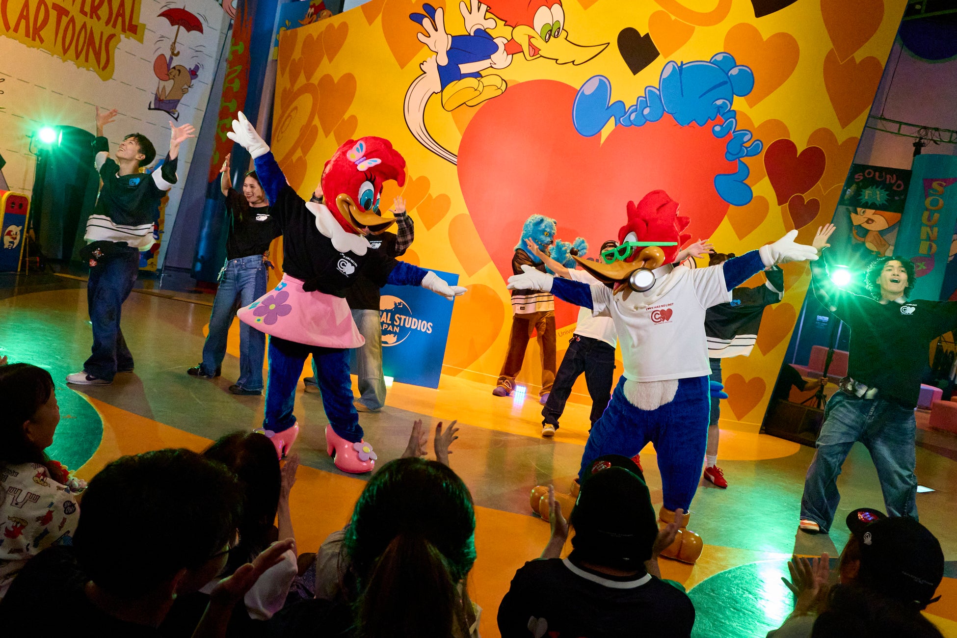イベントのフィナーレを飾るスペシャル・ファッション・ショーには、どデカいサングラスに、特注のLOVE HAS NO LIMITのチャリティTシャツを身につけた超COOLな装いの「DJウッディー・ウッドペッカー」と、同じくお揃いで色違いのTシャツを着た「ウィニー・ウッドペッカー」がエンターテイナーたちを引き連れて登場。エンターテイナーたちは本日から発売する「LOVE HAS NO LIMITチャリティグッズ第3弾」の商品を、ファッション・モデルさながらに着こなし、軽快な音楽に併せダンスを披露。