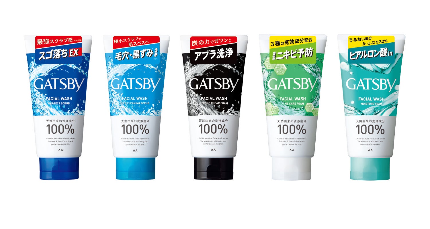 直近5年間のヤング男性の洗顔料使用率は約6~7割で推移しており※1、習慣となっている人も多いことがわかります。これまで、スッキリと洗い上げる洗浄力を一番に求められてきたチューブタイプの洗顔料ですが、近年は男性の肌意識の高まりから、肌へのやさしさも求められるようになってきています。こうしたウォンツに対応する為、男性チューブ洗顔ブランドで売上NO.1※2の「ギャツビー フェイシャルウォッシュ」をリニューアルします。全品に100%天然由来の洗浄成分を採用し、皮脂吸着効果の高いクレイ・脱脂コメヌカを配合。ゴシゴシこすらずに皮脂・毛穴汚れをしっかり落とせ、肌へのやさしさと洗浄力を両立した洗顔料となってヤング男性のウォンツに応えます。