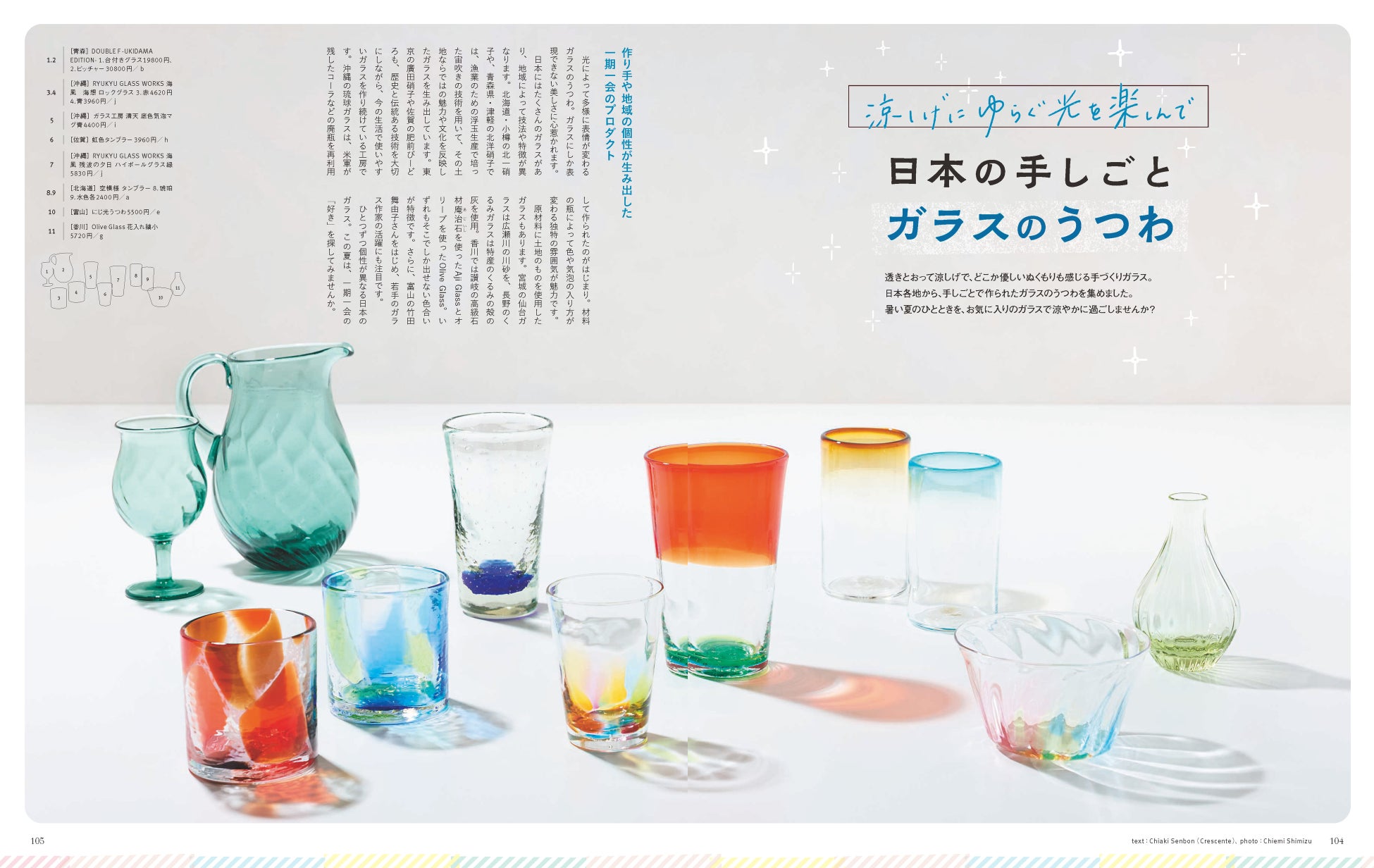 ◆日本各地で手しごとによって作られるガラスのうつわは、涼しげな光と温もりを感じさせます。沖縄の琉球ガラスや小樽の北一硝子など、地域ごとの技法や土地の素材が生み出す、個性豊かな表情が魅力です。(うつわ)