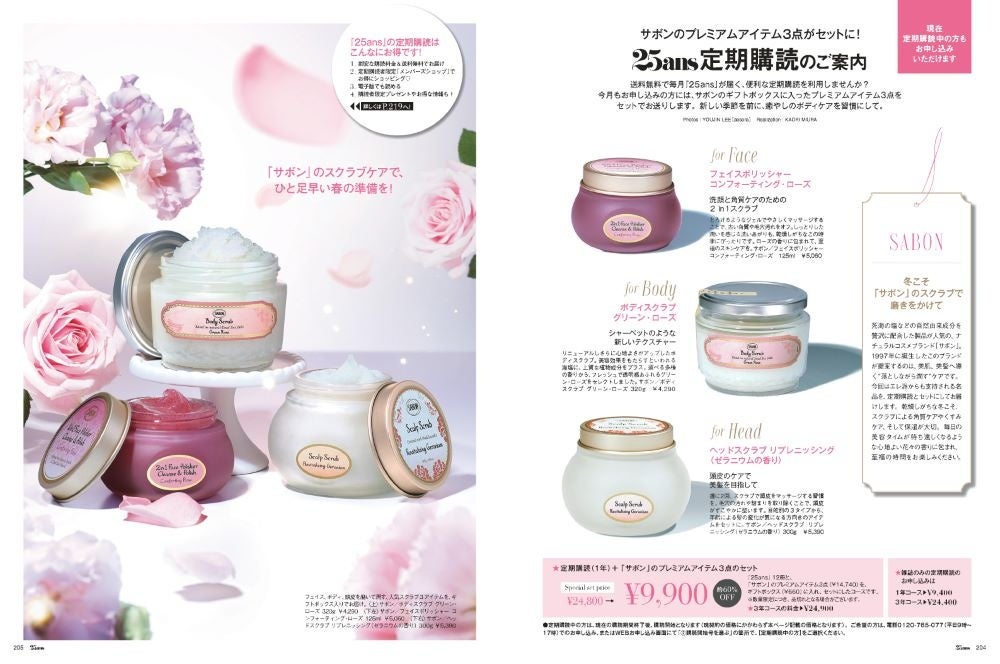 送料無料で毎月『25ans』が届く、便利な定期購読を利用しませんか?今お申し込みの方には、死海の塩などの自然由来成分を贅沢に配合した製品が人気のナチュラルコスメブランド「サボン」のスクラブ3点(ギフトボックス入り・15,400円)をセットでお届けします。乾燥しがちな冬こそスクラブによる全身の潤いケアが大切。毎日の美容タイムが待ち遠しくなるような心地よい花々の香りに包まれ、至福の時間をお楽しみください。定期購読(1年12冊)を新規でお申し込み、または現在定期購読中の方もお申し込みいただけます。
