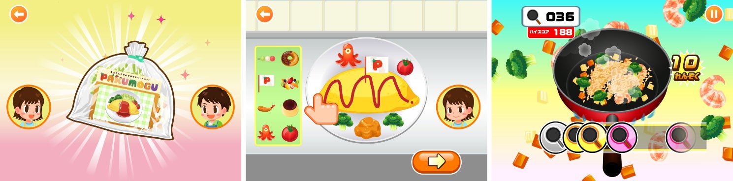 本ゲームは、「オムライス」、「ピラフ」、「グラタン」の3つのメニューで構成され、おうちに届いたミールキット「PAKU MOGU」を使った料理をつくる体験することができます。指でスワイプすることで、オムライスにトッピングするケチャップで自由にお絵描きをしたり、フライパンをタイミングよくタップすることで、ピラフを上手に炒めて高得点を獲得するなど、ゲームを楽しみながら、料理の工程を知ることができます。