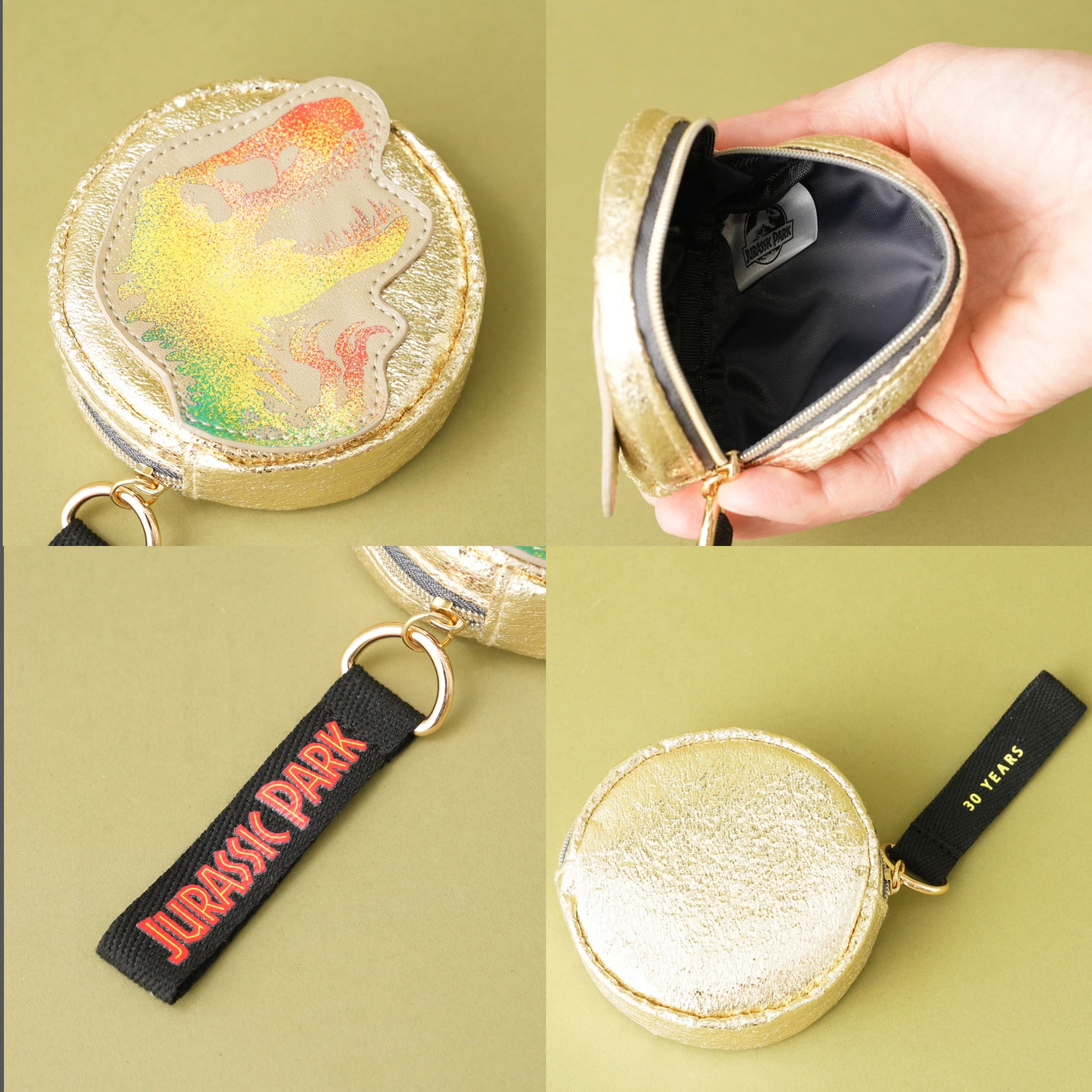 キラキラとしたゴールドの生地にティラノサウルスのダイカット型のパッチが加わり、迫力満載なアイテム。