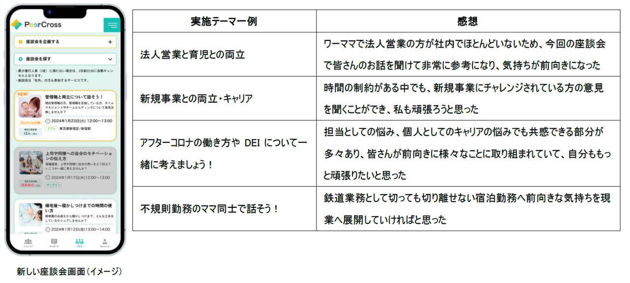 〇JR東日本は、2023年7月よりワーキングマザー向けキャリア形成支援サービス「PeerCross」のトライアルを進めてきました。高い効果が確認されたため、2024年1月から本サービスとしてスタートします。 〇トライアル期間中、多くの企業にご利用いただき、累計約1,200組2,400名のマッチングが成立、約40回の座談会・セミナーを実施しました。 〇2024年1月以降、利用者の声を踏まえ、「更に気軽にマッチング・座談会に参加できる」体験となるよう、サービスをブラッシュアップしたうえで提供をしていきます。 〇引き続き企業や業界の枠を超えたネットワーキングを通じて、個人の状況に応じた中長期的なキャリアを前向きに考えられるよう、利用者に行動変容を促します。 |