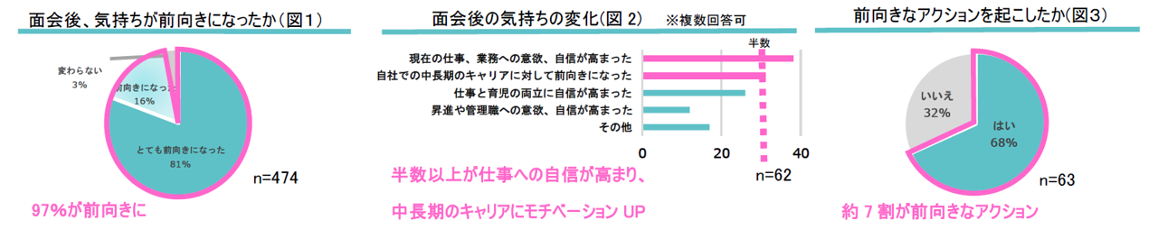 面会後のアンケートでは、前向きになった(図1)と回答していることから、双方にメリットのある面会が多く成立しました。また、大半の方が「相手が社外の方であったことが良かった」と回答しており、利害関係がないため心理的安全性を確保することができています。さらに、半数以上が仕事への自信が高まった(図2)と回答しており、キャリアに対する気持ちの変化が見られました。実際に面会された方のうち約7割がすでに「前向きなアクションを起こした」(図3)という結果も出ています。具体的には「副業にチャレンジした」「社内インターンに参加した」「社内新規事業プログラムに応募した」などが挙げられています。