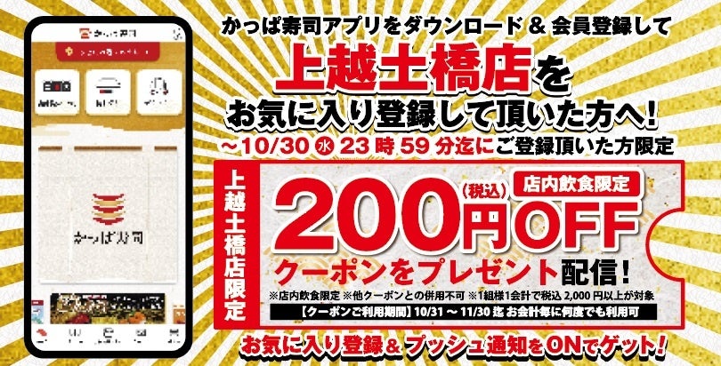 公式アプリ(https://www.kappasushi.jp/app.html)をダウンロード&会員登録いただき、10 月 7 日(月)から10 月 30 日(水)23 時59 分までに『上越土橋店』をお気に入り登録いただくと、10 月31 日(木)から11 月 30 日(土)まで、お会計毎に何度でもご利用いただける“店内飲食限定200円(税込)OFFクーポン”をプレゼント配信いたします。