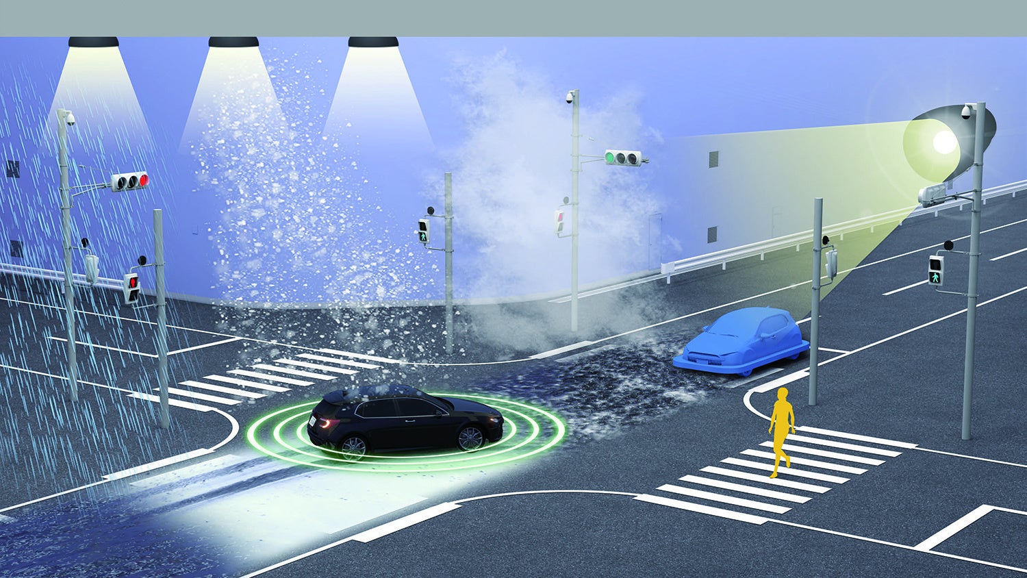 安心・安全なモビリティ社会とするため、自動運転システムにとって過酷な雨、霧、雪、逆光などの自然環境に加え、多様な走行シナリオを自由に組み合わせ、高精度かつ繰り返し可能な試験環境を屋内で実現するシステムです。