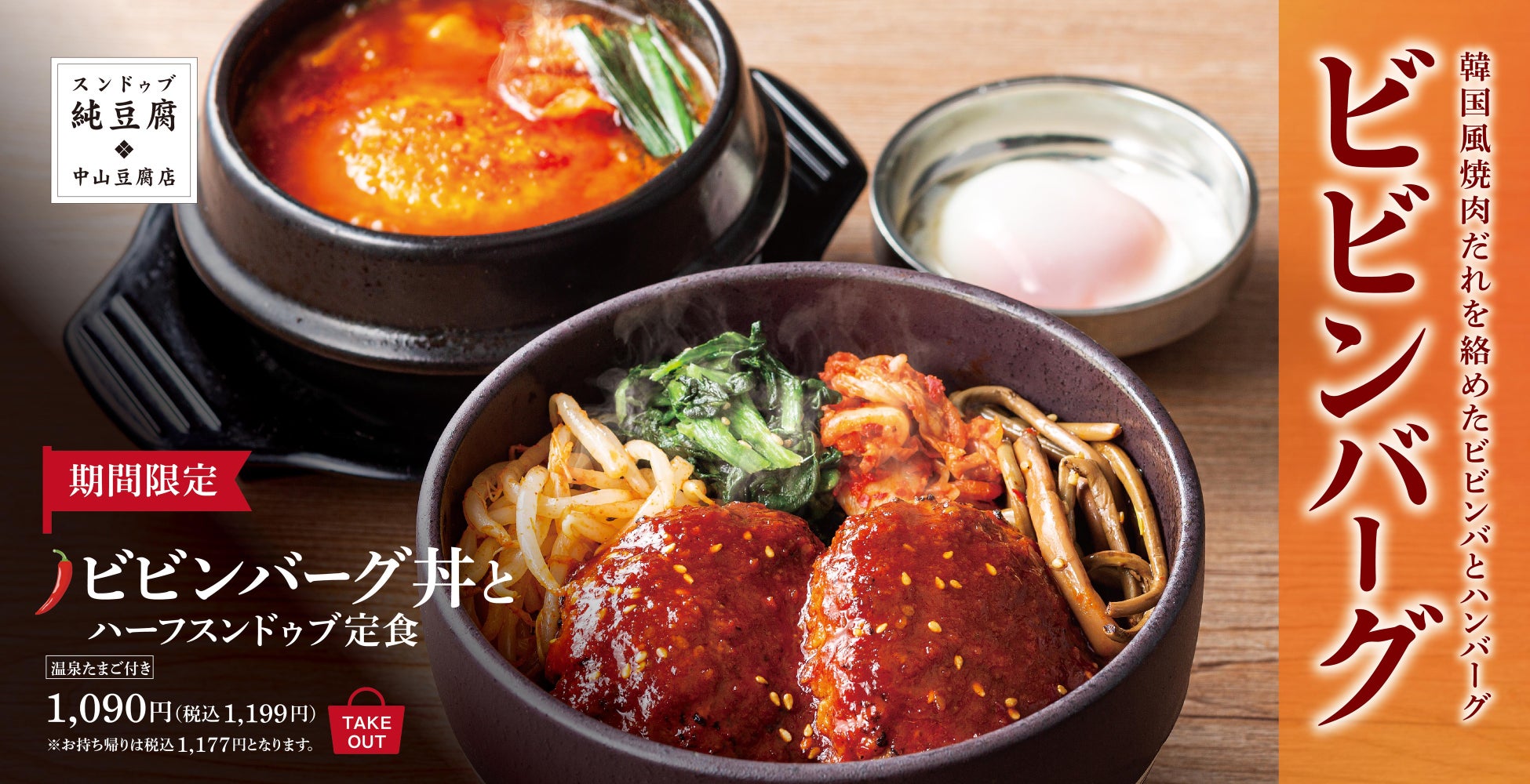中山豆腐店の人気メニュー「ハーフスンドゥブ定食」シリーズの新作は、肉感強めのハンバーグを韓国風焼肉だれで絡めてビビンバーグ丼に仕立てました。ナムルとご飯を、お好み加減にハンバーグを崩して丼の中で混ぜ合わせれば、スプーンが止まらなくなる一杯です。からっぽになった丼は、終わりではなくはじまりの合図です。「ご飯おかわり」の声掛けで店内おかわり無料のご飯をハーフスンドゥブと楽しむ二杯目が始まります。冬の寒さが一層厳しくなったこの時期に、「中山豆腐店」は熱々のハーフスンドゥブとボリューム満点なビビンバーグ丼で頑張る人を応援します。