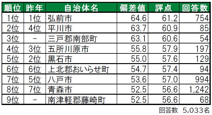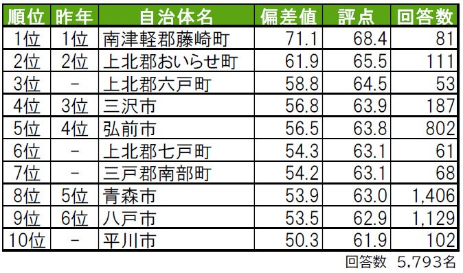 1位は2年連続で南津軽郡藤崎町で、唯一偏差値70台の高い評価を得ており、「街に愛着がある」3位、「街に誇りがある」4位、「住みここち」5位と各ランキングでも高評価です。2位も2年連続で上北郡おいらせ町で、「住みここち」1位の町です。3位の上北郡六戸町は、昨年は累計回答数が50名未満だったためランキング集計対象外だった町です。