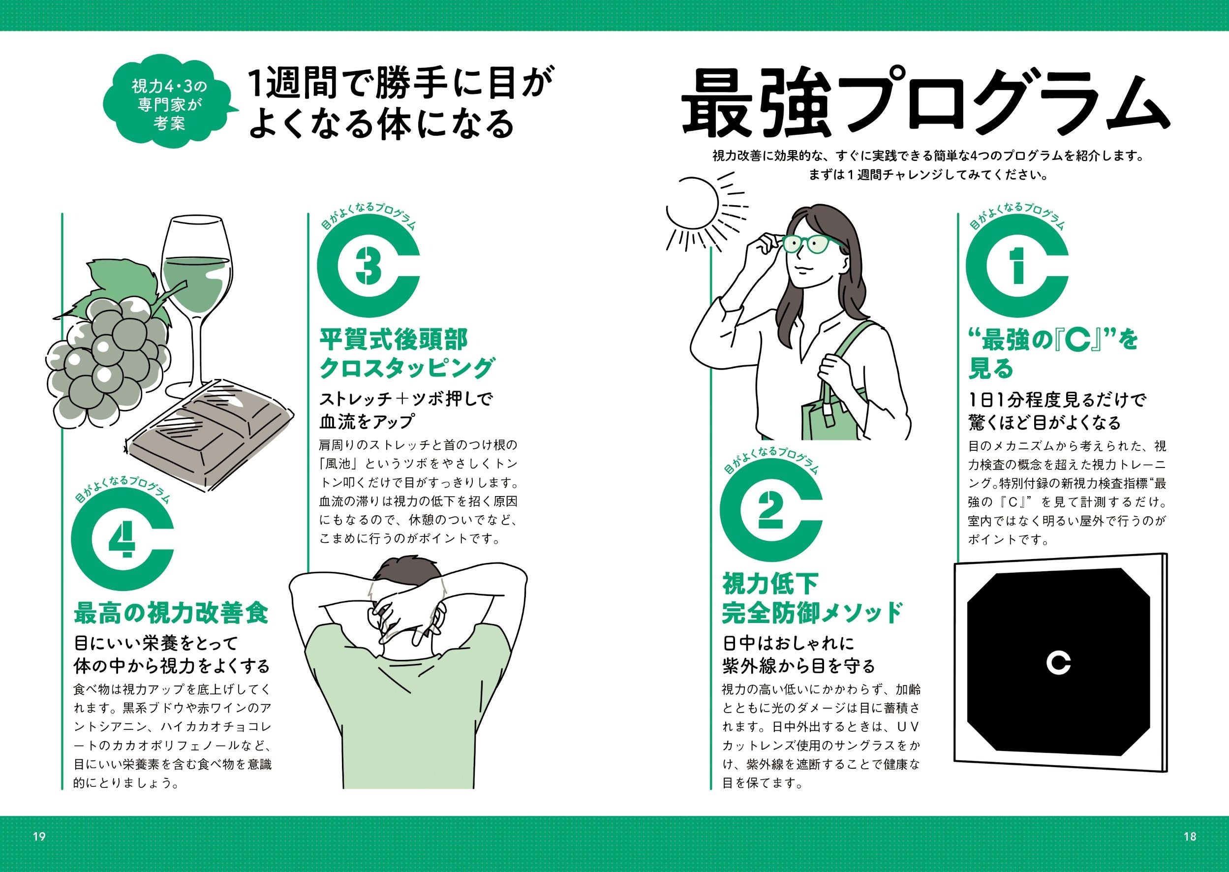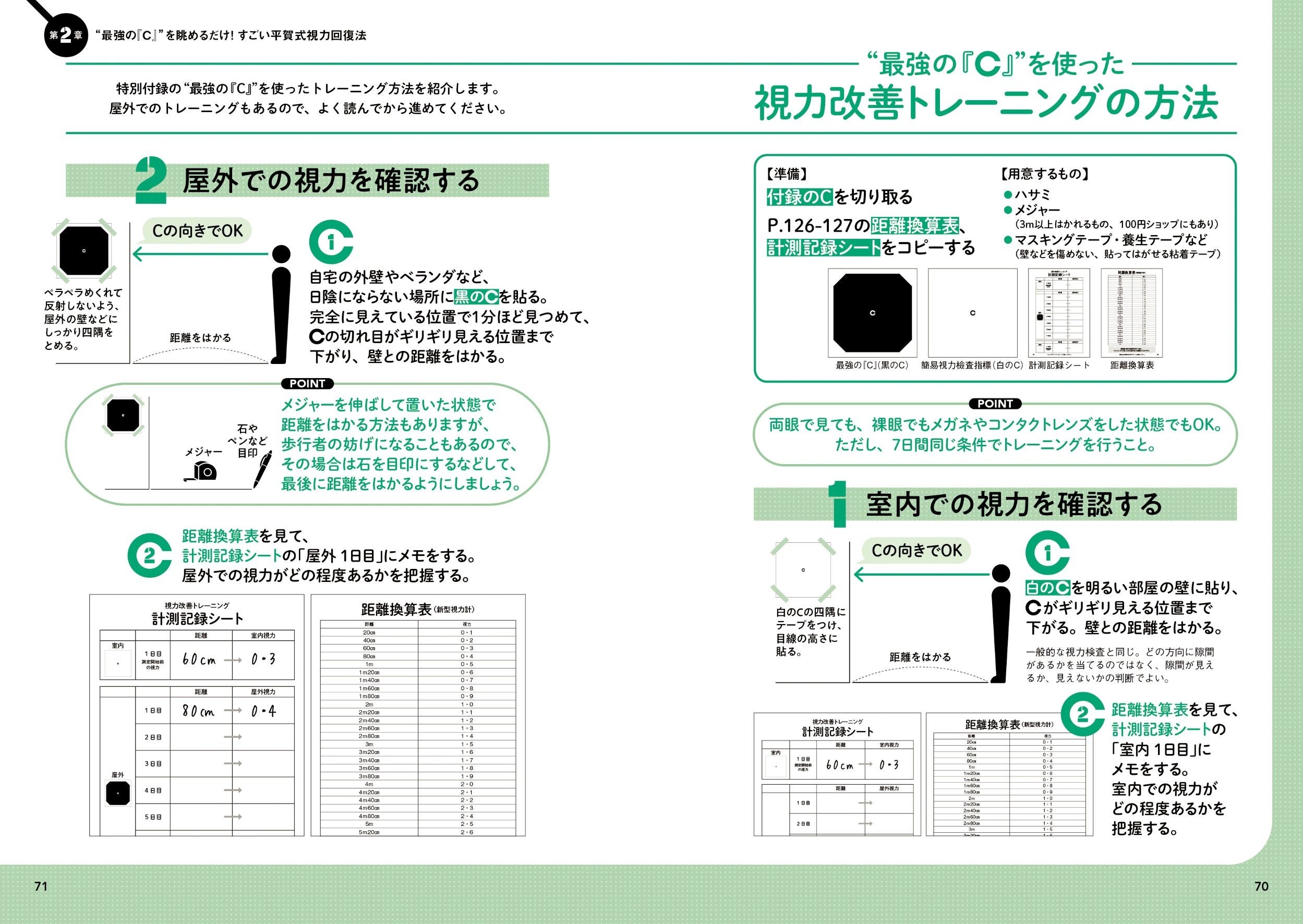 最大の目玉は、本書に付属している特殊な視力検査表『最強のC』です。 背景が黒のこの表を「見るだけ」で、なぜ驚くほど目が良くなるのか? 科学的な裏付けに基づいた、誰でも・どこでも・今日から始められる視力回復の極意を凝縮しました。