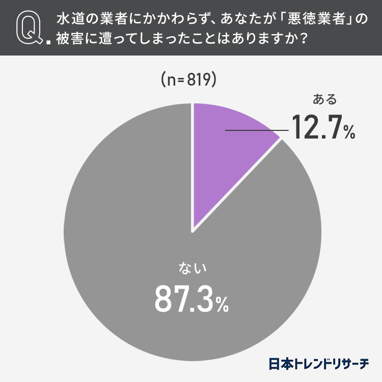 今回は、みんなの町の水道職人と共同で、事前調査で「水まわりのトラブルに遭ったことがある」と回答した全国の男女819名を対象に、「悪徳業者からの被害」についてアンケートを実施しました。