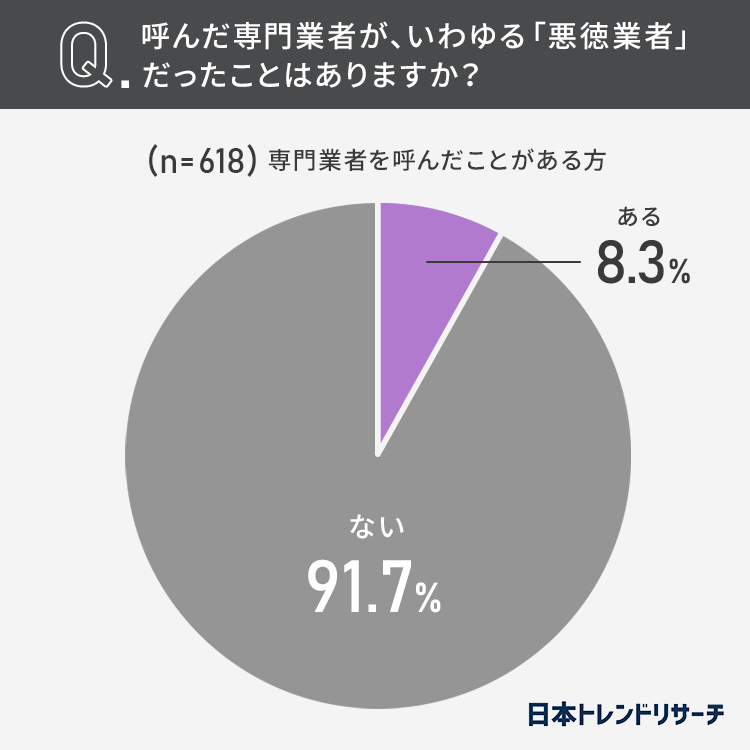 水まわりのトラブルで業者に依頼したことがある方のうち、8.3%の方が「悪徳業者」の被害に遭ってしまったことがあると回答しました。