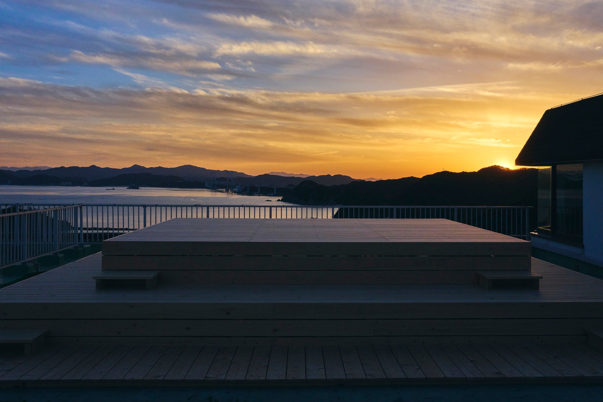 海と空を琥珀色に染める夕陽に出会うKOHAKUテラス
