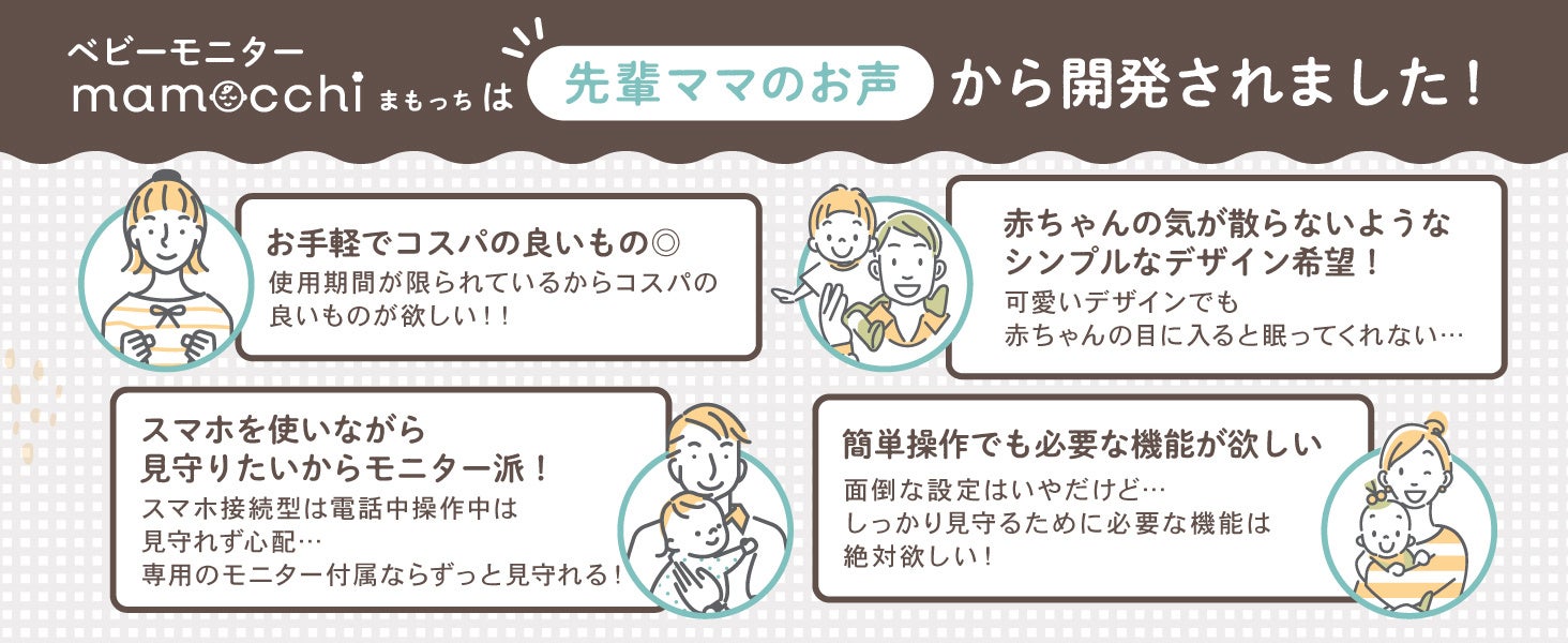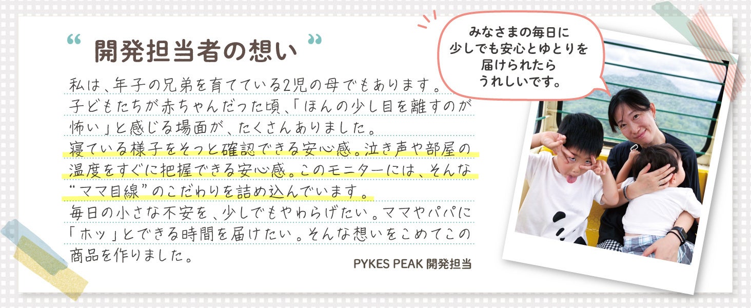 「子どもたちが赤ちゃんだった頃、“ちょっと目を離すのがこわい”と感じる場面がたくさんありました。泣き声や寝息、部屋の温度まで、そっと確認できる安心感。『まもっち』には、そんな“ママ目線”のこだわりを詰め込んでいます。がんばるママやパパに、“ホッ”とできる時間をお届けしたいという想いで開発しました。」