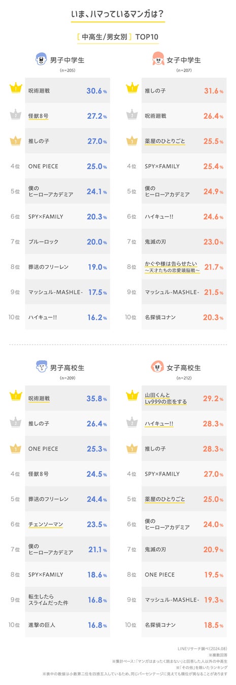 【LINEリサーチ】中高生がハマっているマンガランキング(2024年版)、「呪術廻戦」「推しの子」が人気!「週1日以上」マンガを読む中高生は5割超