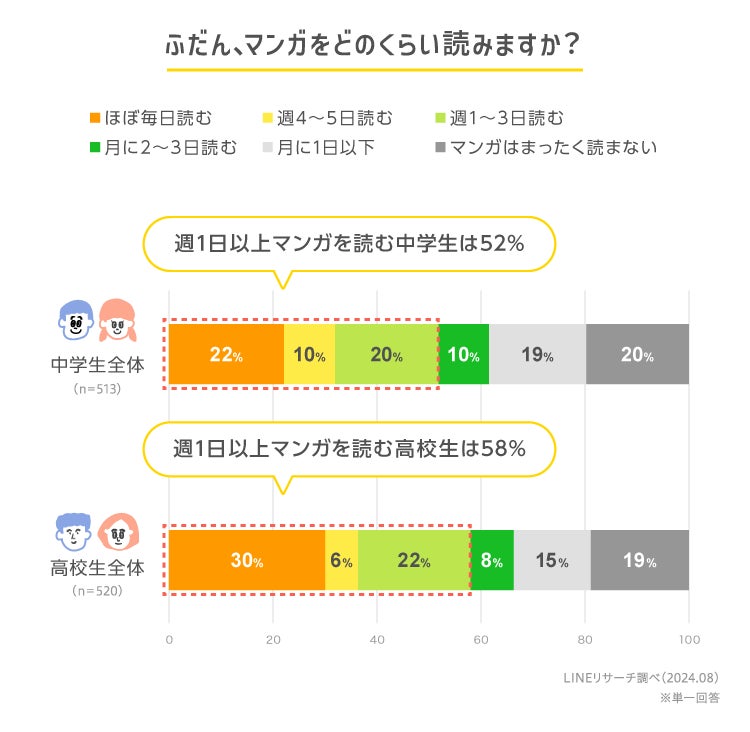「LINEリサーチ」では、全国の中高生を対象に、マンガを読む頻度や、ハマっているマンガなどについて調査しましたので、結果をお知らせします。