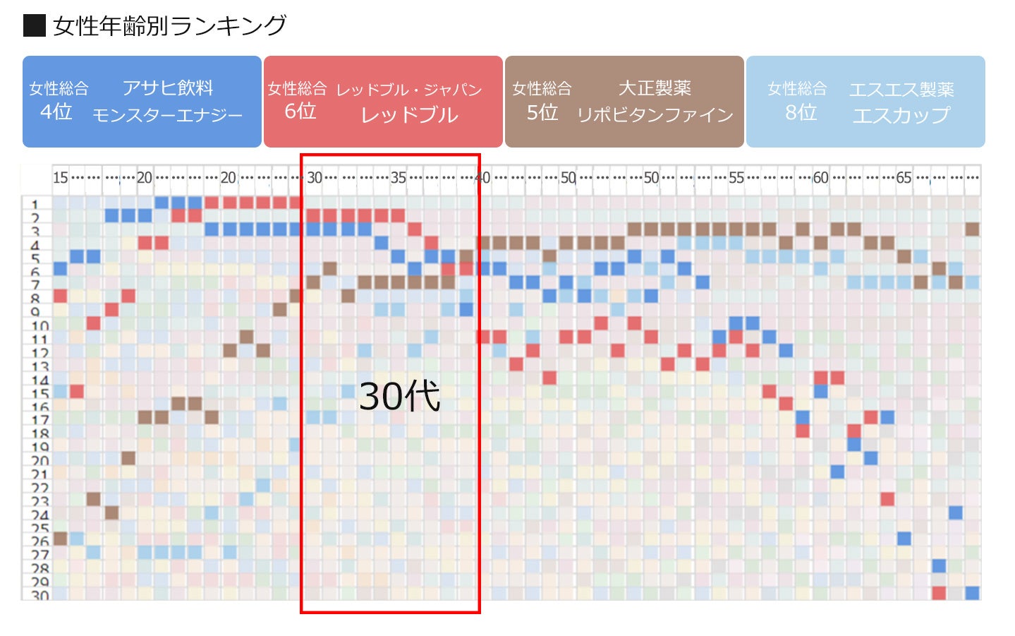 その他にも、男性総合4位のサントリーホールディングス「ZONe Ver.1.3.9 缶 500ml」などのエナジードリンクは年齢が下がるとともにランキングは下落し、反対に、佐藤製薬「ユンケルローヤル200 100ml」、興和「キューピーコーワαドリンク 100ml」などの栄養ドリンクは年齢が上がるとともにランキングが上昇する傾向もみられました。