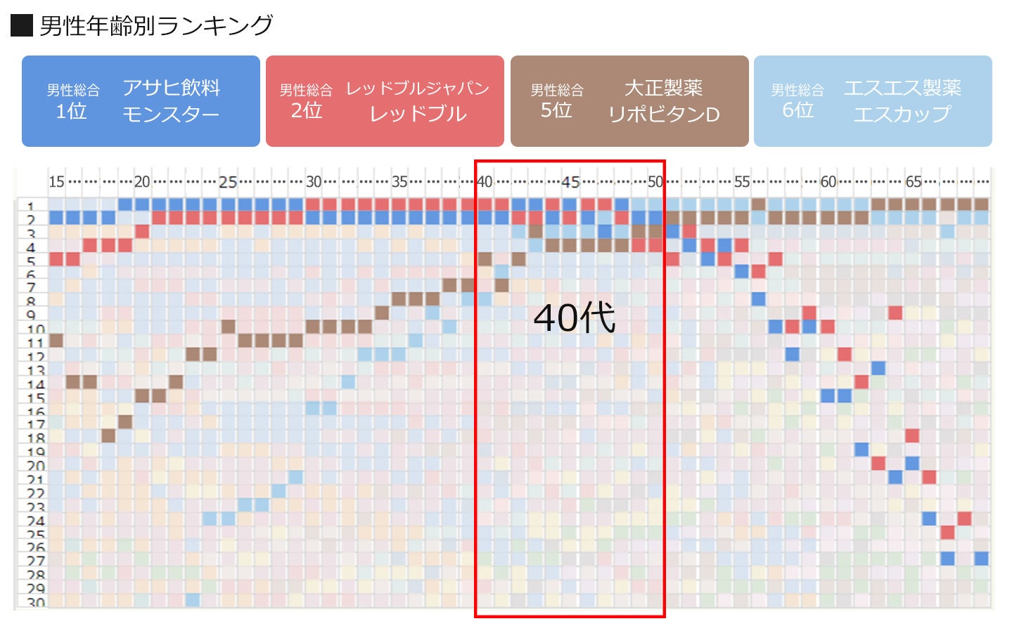 身体を意識し始める40代を境に、エナジードリンクから栄養ドリンクへシフトをする可能性が伺えます。