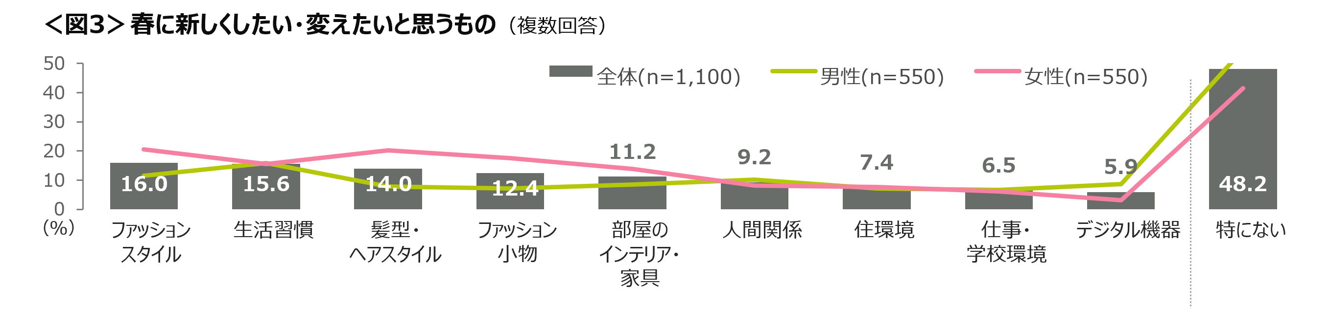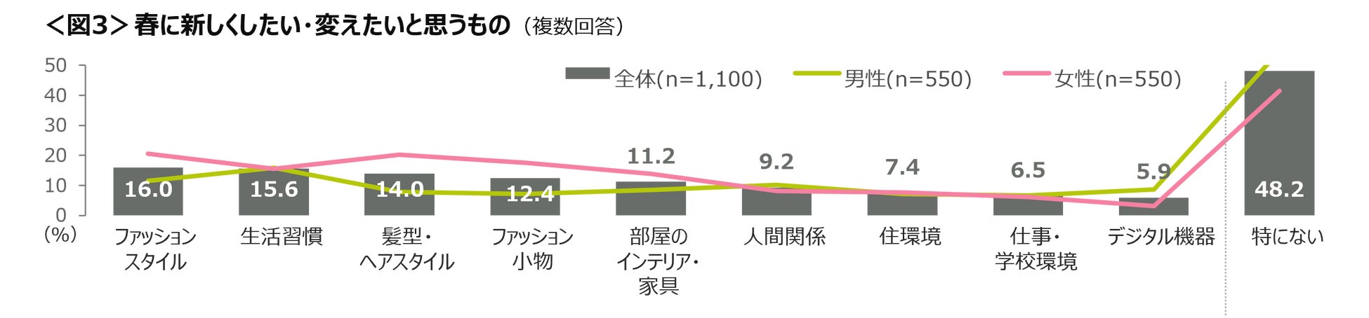 新しくしたい・変えたいと思うものは、「ファッションスタイル」「生活習慣」「髪型・ヘアスタイル」がTOP3。