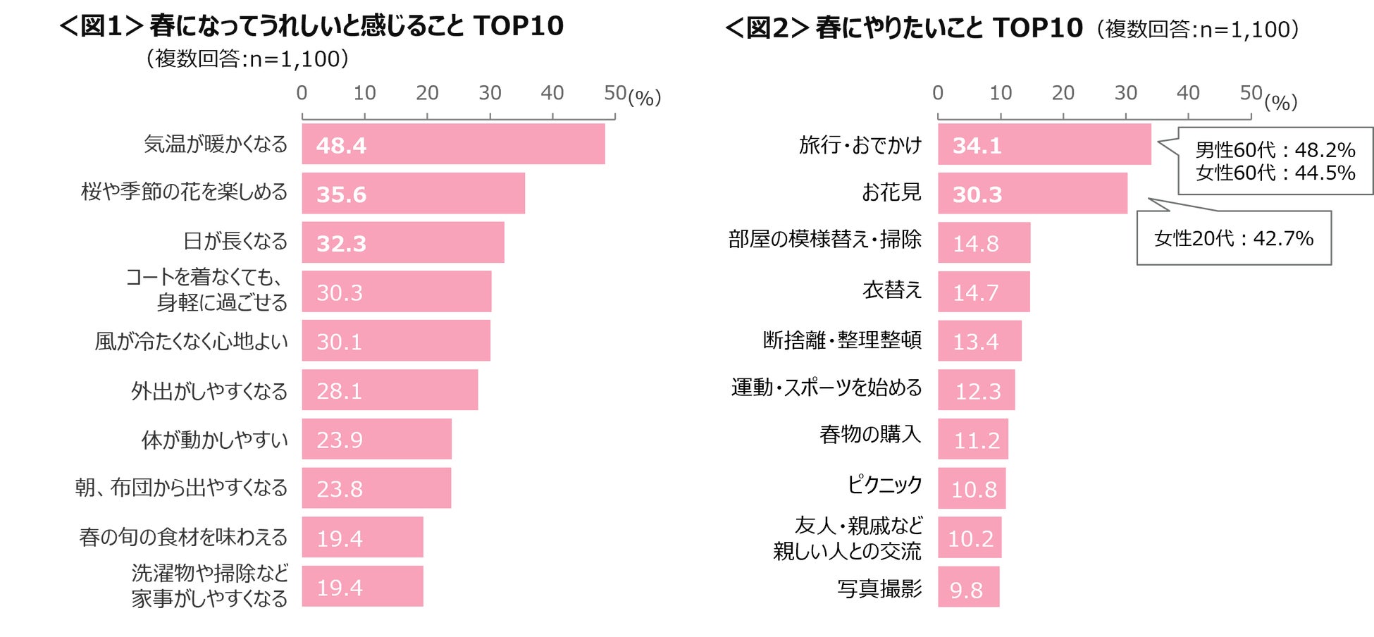 春にやりたいことは、「旅行・おでかけ」「お花見」が3割で、レジャーへの関心が高い。