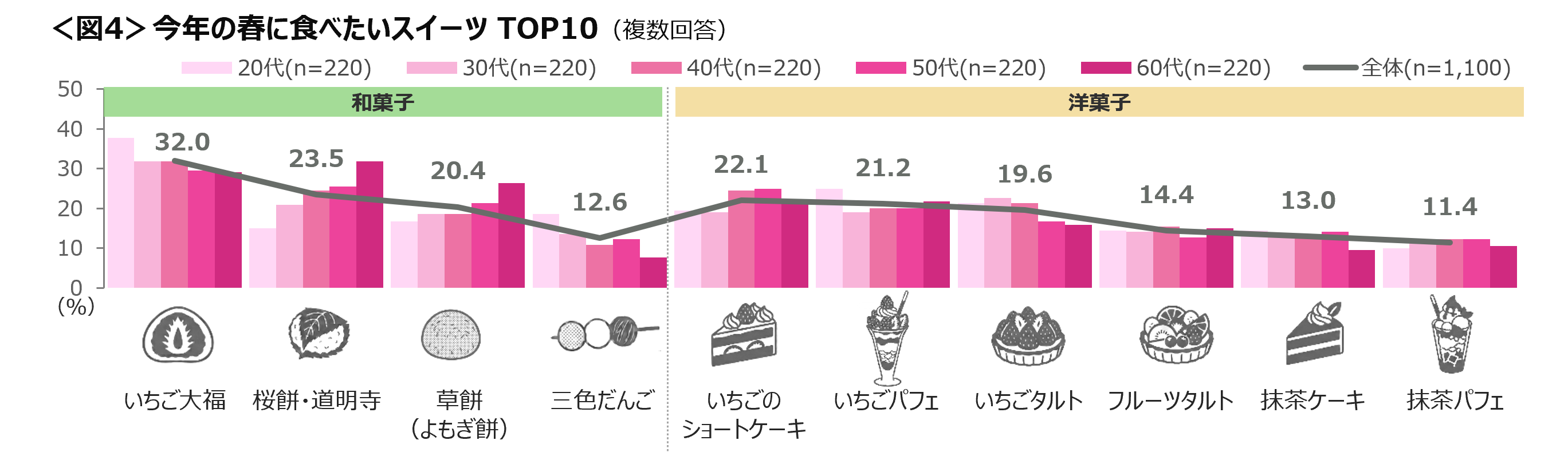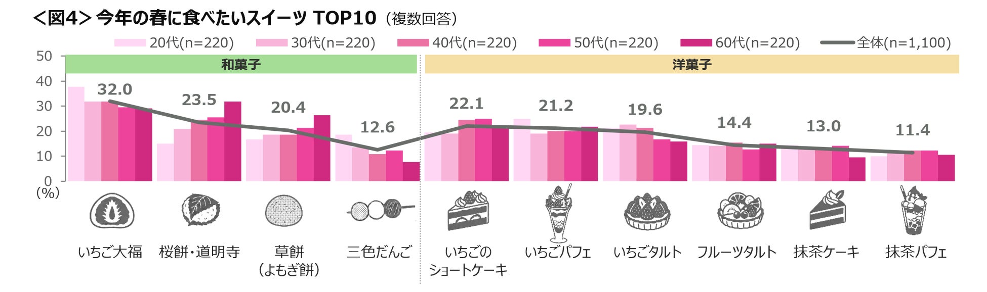 「いちご大福」「いちごパフェ」は20代で、「桜餅・道明寺」「草餅(よもぎ餅)」は60代で多い。<図4>