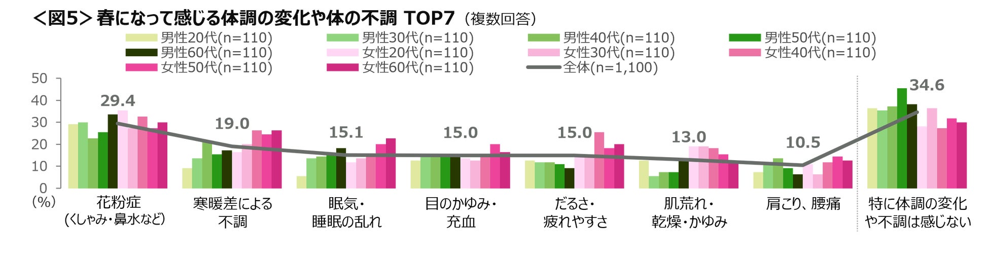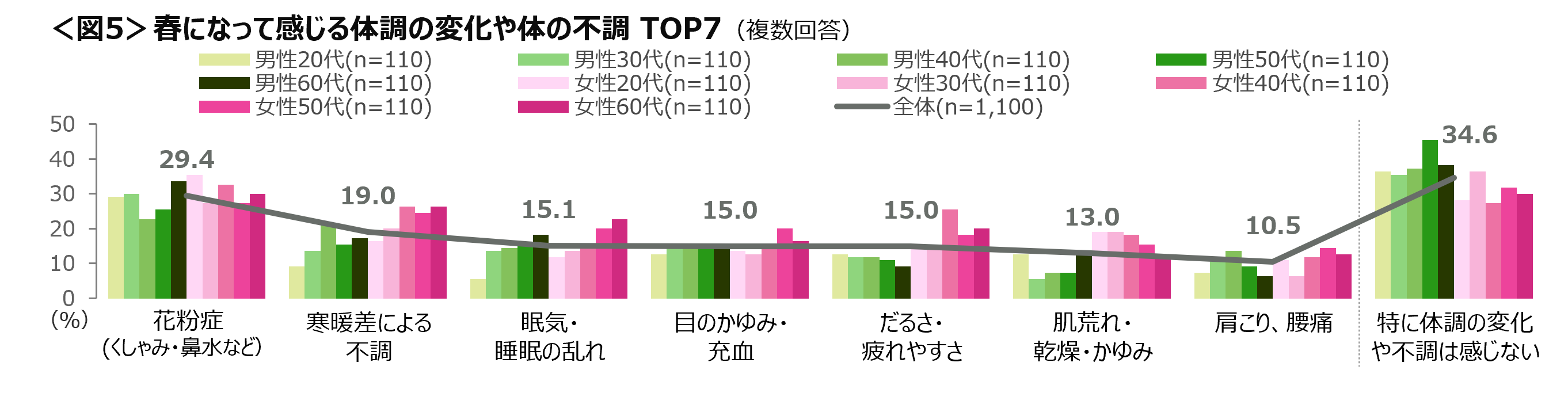 次いで「眠気・睡眠の乱れ」「目のかゆみ・充血」「だるさ・疲れやすさ」が続く。女性40~60代は「寒暖差による不調」「眠気・睡眠の乱れ」「だるさ・疲れやすさ」が高く、春バテを感じている傾向がみられる。<図5>