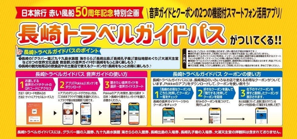 株式会社日本旅行(本社:東京都中央区、代表取締役社長:小谷野悦光)は、個人向け国内旅行ブランド「赤い風船」商品をご購入のお客様へ、音声ガイドとデジタルクーポン機能を実装したスマートフォン活用アプリ「長崎トラベルガイドパス」の提供を10月より期間限定で行います。