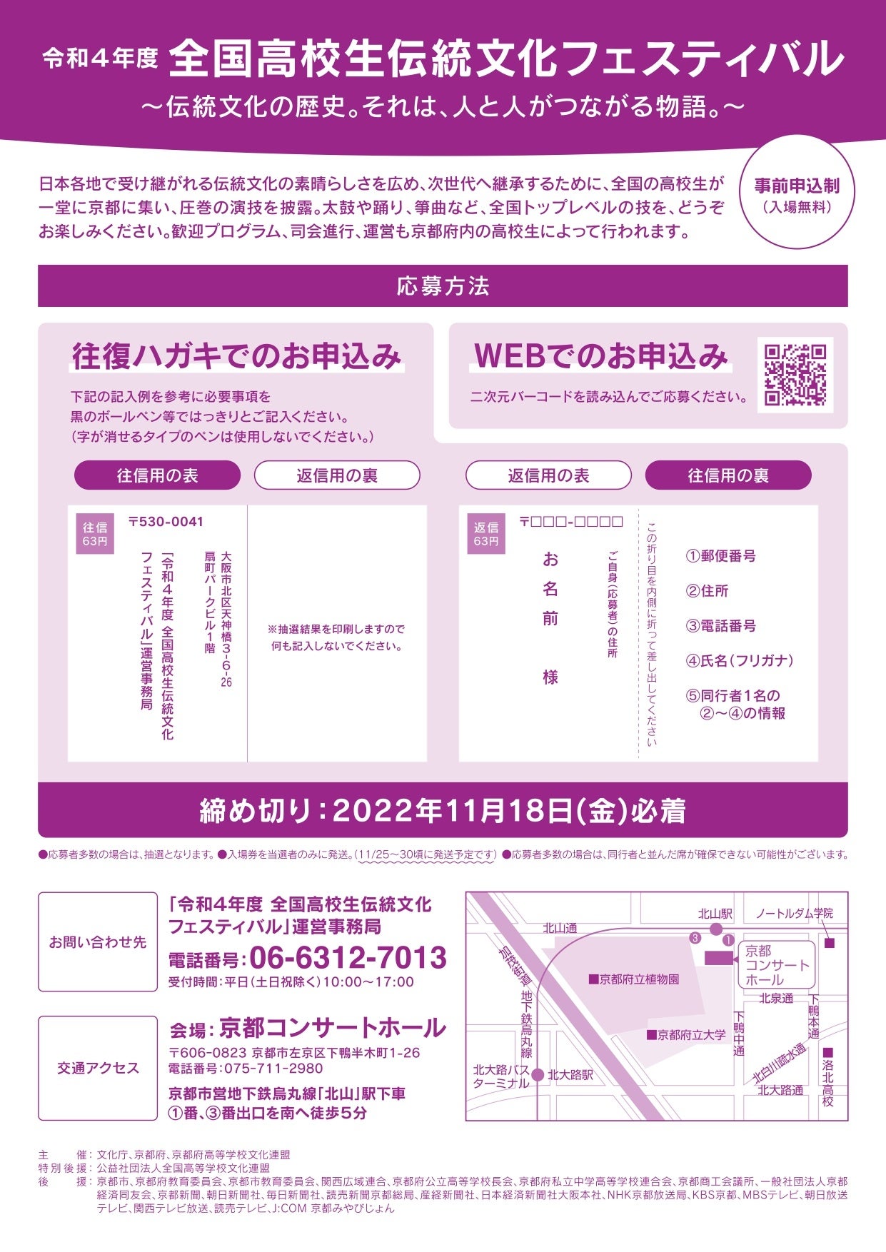 送付先▶〒530-0041 大阪市北区天神橋 3-6-26 扇町パークビル1階 令和4年度全国高校生伝統文化フェスティバル運営事務局