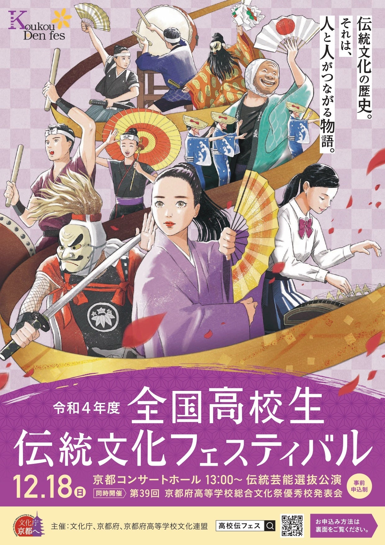 ■ 文化庁、京都府、京都府高等学校文化連盟では、伝統文化の継承・発展に取り組む高校生の“晴れの舞台”となる「令和4年度全国高校生伝統文化フェスティバル」を 12 月 17 日(土)、18 日(日)に開催します。