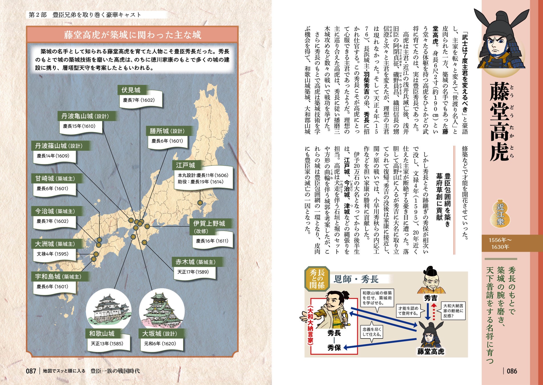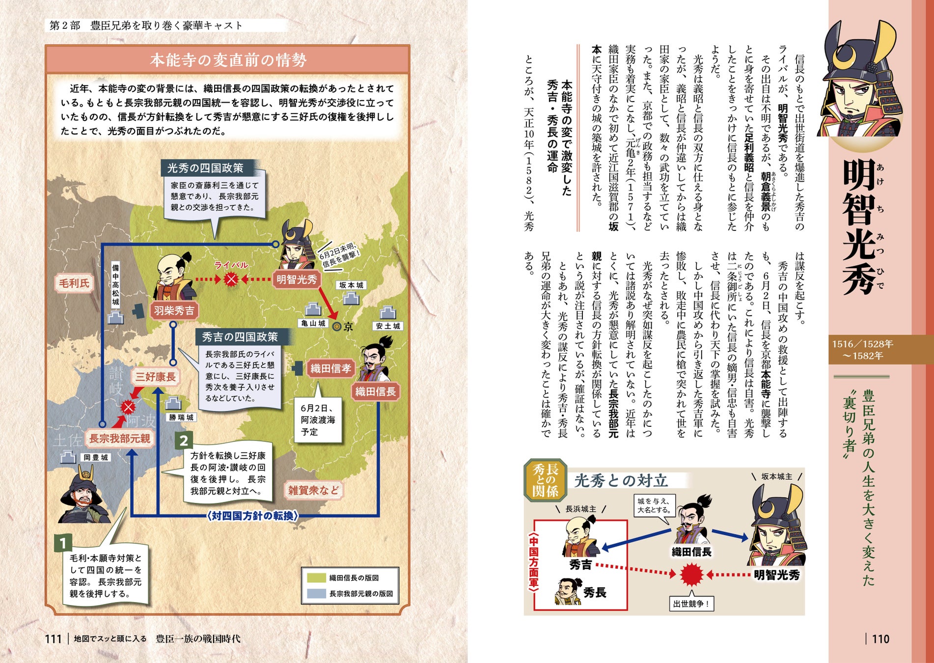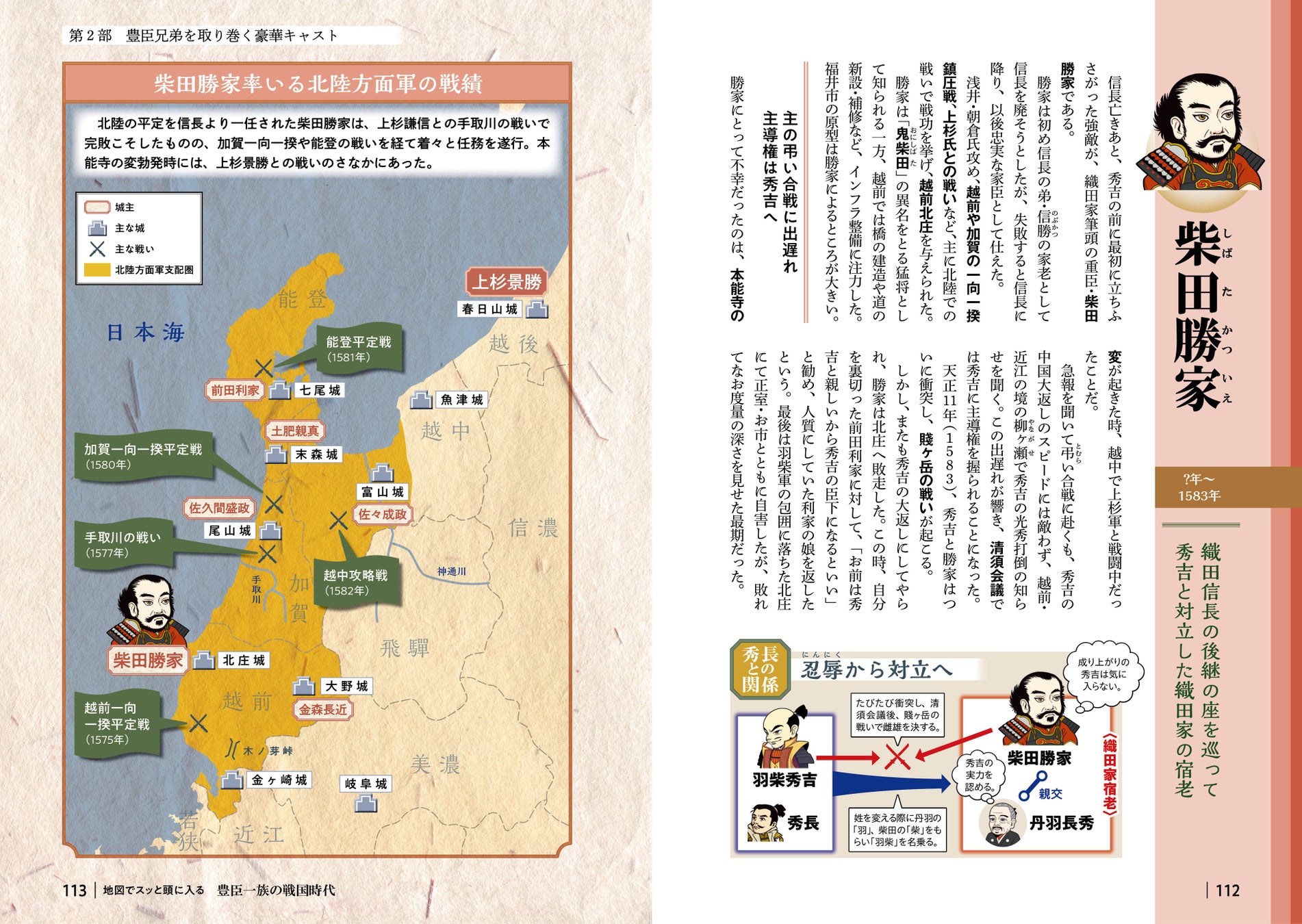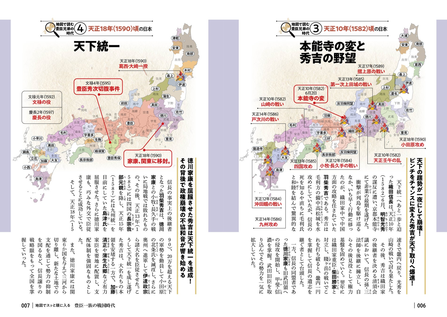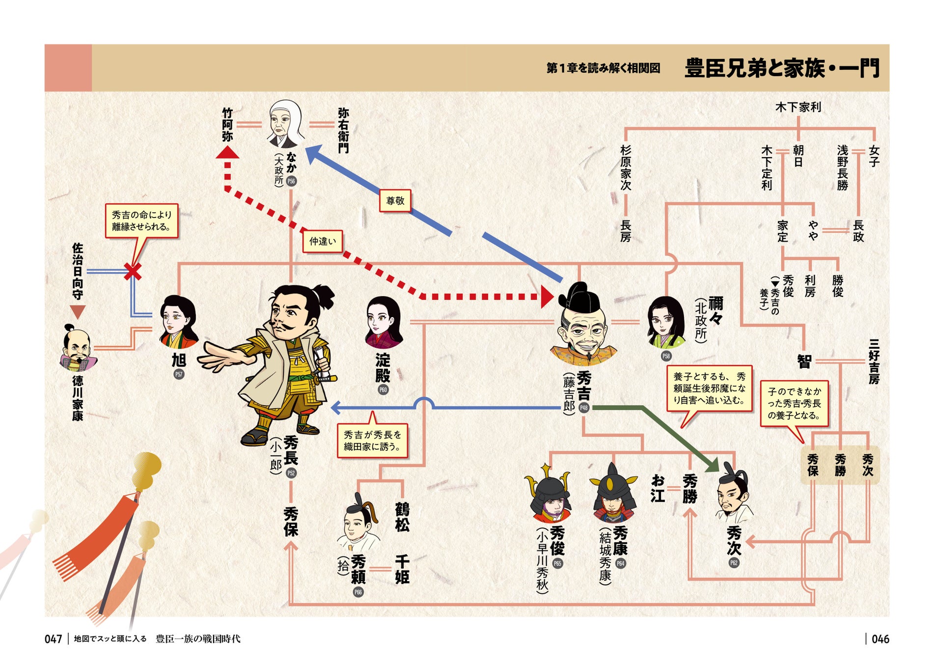 例えば「第2部 豊臣兄弟を取り巻く豪華キャスト」では、各章の冒頭に豊臣家や家臣団、ライバルたちの複雑な人間関係がスッと頭に入る「相関図」を掲載 。続く各人物紹介では、豊臣家、家臣団、ライバルから総勢38名を採り上げ、その生涯や重要な出来事を本シリーズならではのわかりやすい地図や図解と共に解説。彼らの個性や時代における役割が明確になり、戦国ドラマの理解が深まります。