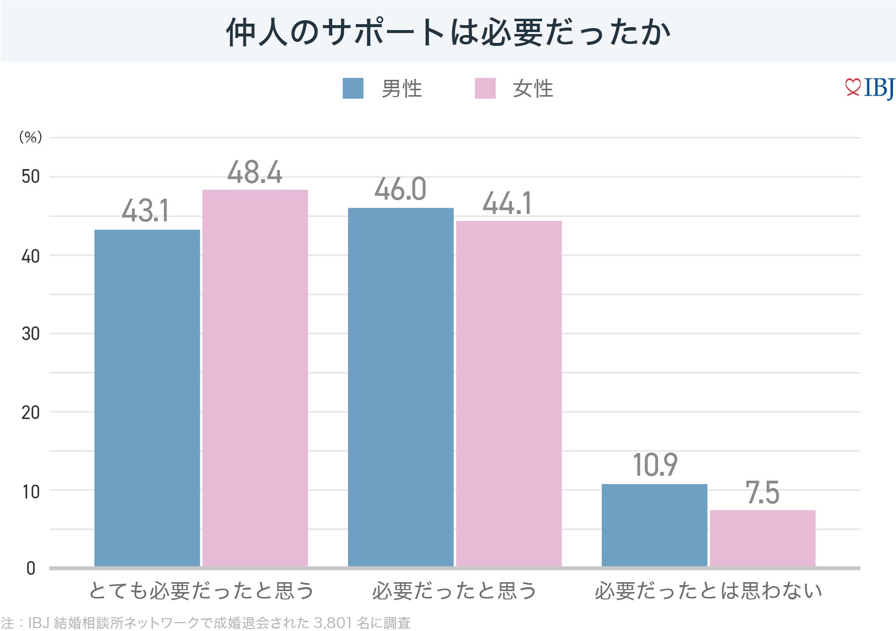 仲人のサポートが必要だったか伺うと、男女共に9割の方が「必要だった」と回答しました。IBJの結婚相談所は、マッチングアプリと違い、仲人が成婚(婚約)までを一緒に伴走し、一人ひとりに合わせたこまやかなサポートを行うことが成婚率の高さに繋がっています。